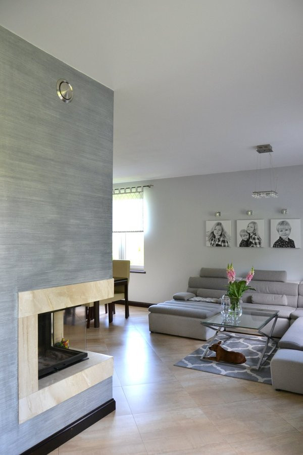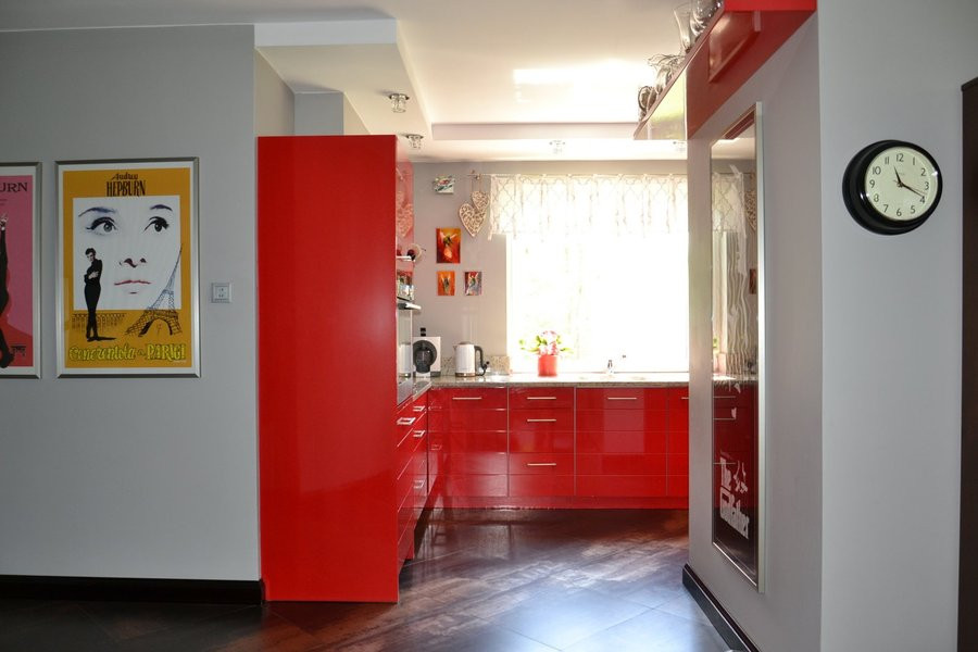 Początkowo Kasia zamierzała dopasować styl urządzenia pomieszczeń do bryły domu. Miało być wszędzie tradycyjnie. Zmieniła zamysł po obejrzeniu kuchni u koleżanki - nowoczesny wygląd zabudowy tak ją oczarował, że poprzednie plany wzięły w łeb. Kiedy w kuchni stanęły lakierowane meble w czerwonym kolorze, para zaczęła meblować resztę pomieszczeń współczesnymi elementami wystroju. Nie popadła jednak ze skrajności w skrajność. Łącznikami stylistycznymi są m.in. klasyczne posadzki z drewna dębowego i gresu, klatka schodowa z betonu, drewna i stali, dębowe drzwi wewnętrzne.