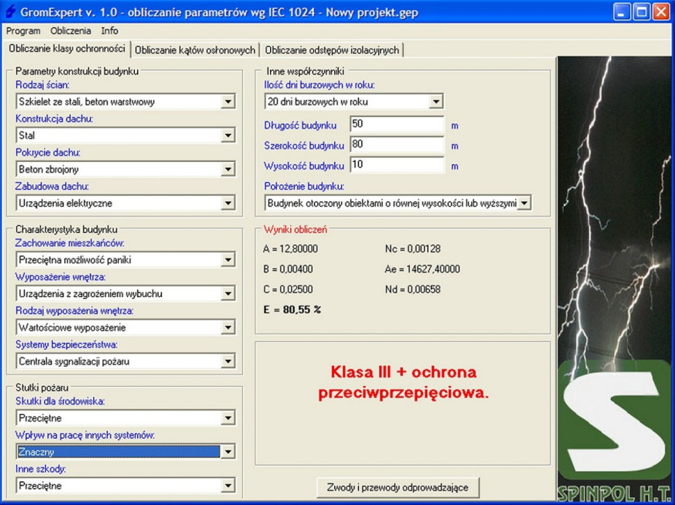 Przedsiębiorstwo SPINPOL H.T., jako jedna z czołowych polskich firm zajmujących się ochroną odgromową, opracowało i bezpłatnie udostępnia program służący do samodzielnej oceny ryzyka piorunowego. Każdy może pobrać ten program i uruchomić go, co powinno wystarczyć do określenia klasy ochronności obiektu, a więc i poziomu wymaganej ochrony odgromowej.