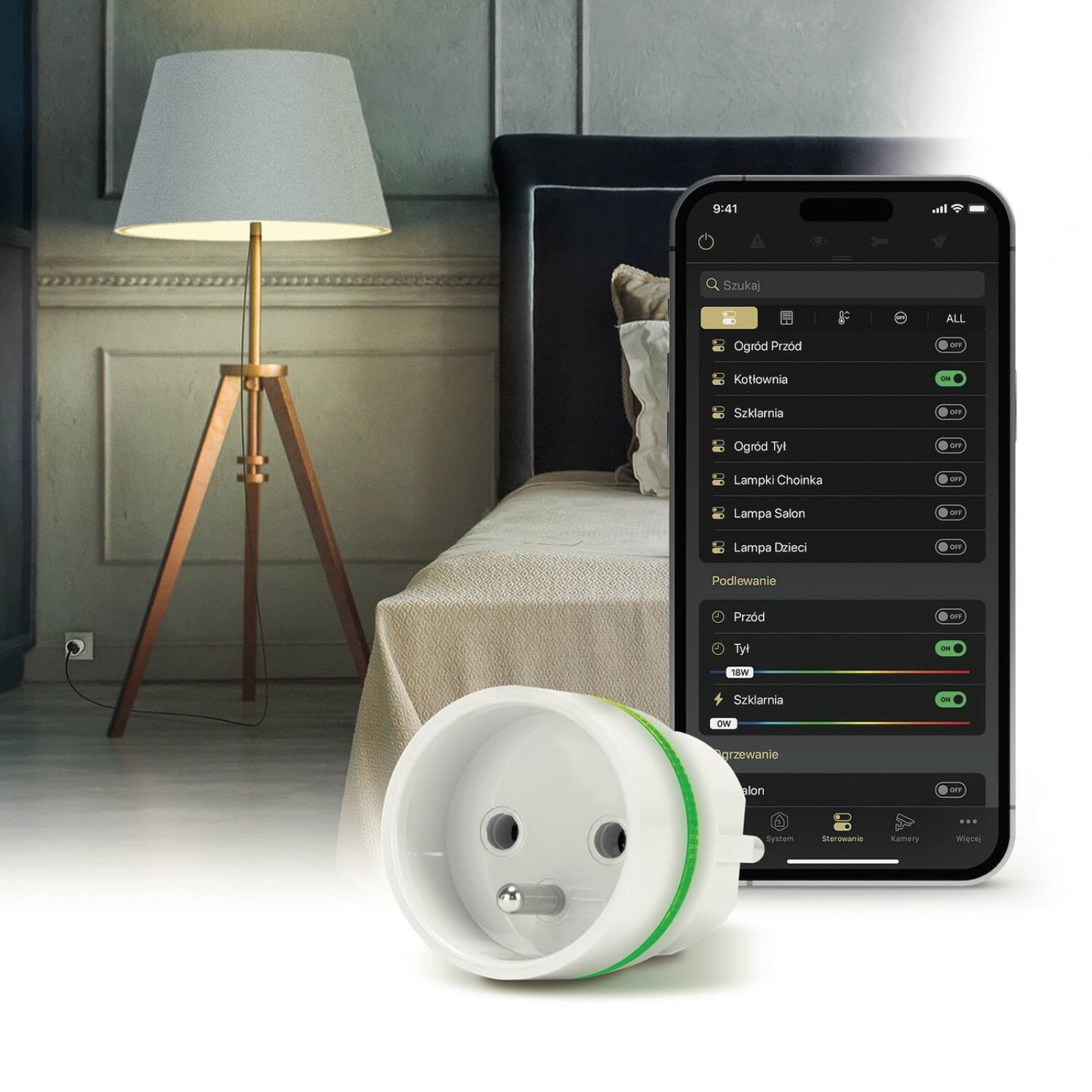 Po podłączeniu wolnostojącej lampy do tzw. inteligentnej wtyczki, będziemy mogli nią sterować za pomocą aplikacji mobilnej, fot. SATEL