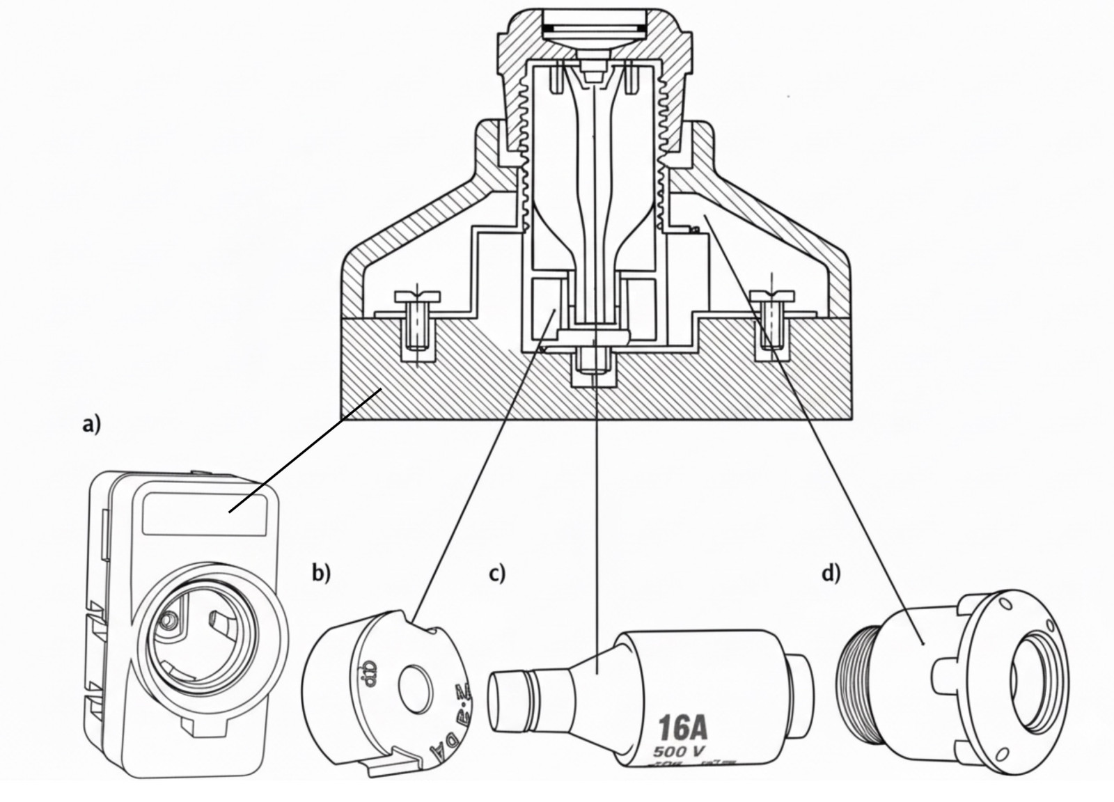 Bezpiecznik topikowy typu D, części składowe: a) gniazdo bezpiecznikowe, b) wstawka kalibrująca, c) wkładka topikowa, d) główka bezpiecznikowa. (Źródło: K. Trzebiatowski, www.elektro.info.pl)