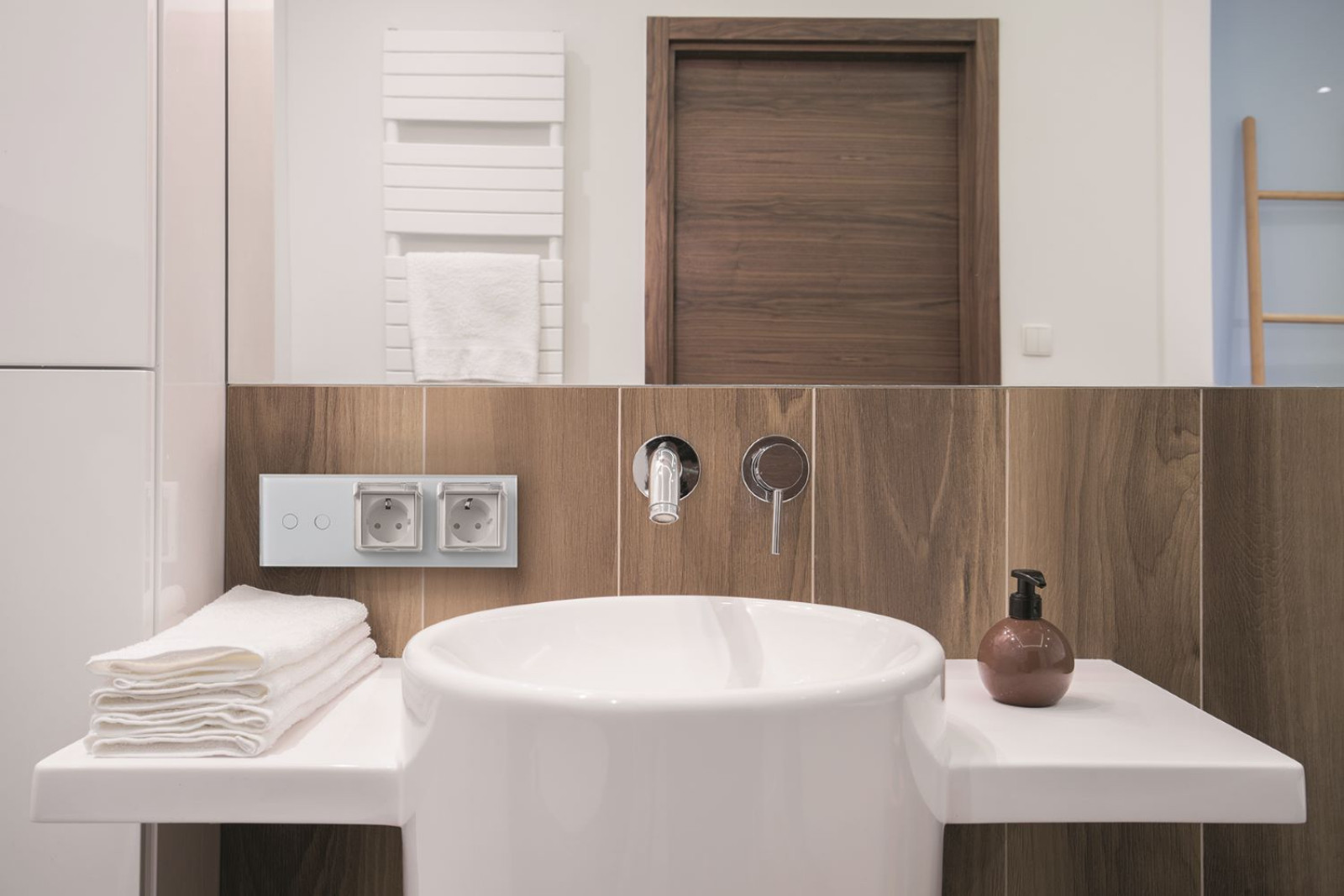 W praktyce przyjmuje się zasadę, by gniazda i łączniki trzymać co najmniej 60 cm od stref mokrych (wanna/prysznic) oraz dobierać odpowiedni osprzęt i zabezpieczenia. Szczegóły powinien potwierdzić elektryk, bo liczy się układ łazienki i strefy ochronne.