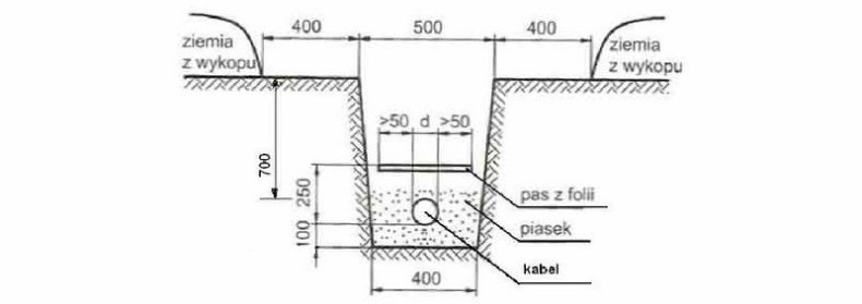 Wzdłuż zaplanowanej trasy przebiegu kabla robimy wykop na głębokość ok. 80 cm. Na jego dnie wykonujemy 10 cm podsypkę z piasku i na niej swobodnie układamy dobrany przez projektanta kabel tak, aby nigdzie nie był naprężony. Następnie przysypujemy go warstwą piasku grubości ok. 25 cm, starając się wyeliminować kamienie, cegły oraz inne ostre przedmioty, mogące naruszyć jego izolację. Na górnej warstwie piasku układamy niebieską folię ostrzegawczą, sygnalizującą w przyszłości osobie robiącej w ogrodzie wykopy, że pod spodem przeprowadzono kabel elektryczny. Całość zasypujemy ziemią z wykopu, wyrównując teren.