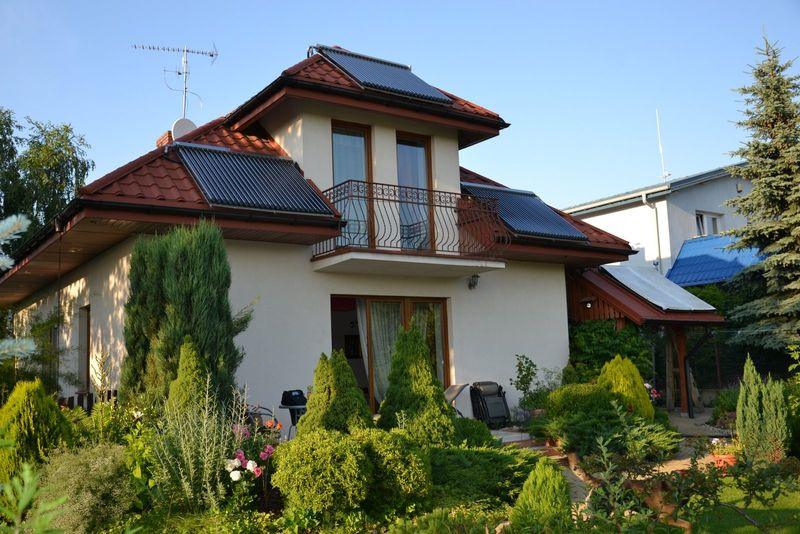 Tym, którzy zamierzają mieć kolektory słoneczne radzę dobrać projekt domu z odpowiednią ilością miejsca na dachu. Nasz kopertowy dach jest nieduży i na dodatek od strony południa ma lukarnę. Musieliśmy pogrupować rurki próżniowe w kilka zestawów. Instalację z elastycznych przewodów ukryliśmy pod gąsiorami, w rynnach. Mieliśmy z żoną trochę obaw związanych z estetyką dachu, pokrytego blachodachówką, ale już przyzwyczailiśmy się do połaci niemal całkowicie zasłoniętej przez kolektory. Montaż nowej instalacji trwał 2 dni i przeprowadzało go dwóch monterów. Wszystko przebiegło sprawnie.