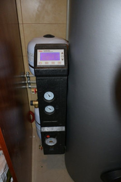 Elementy instalacji: zespół pompowy, cyfrowy różnicowy regulator temperatury, z tyłu solarne naczynia przeponowe