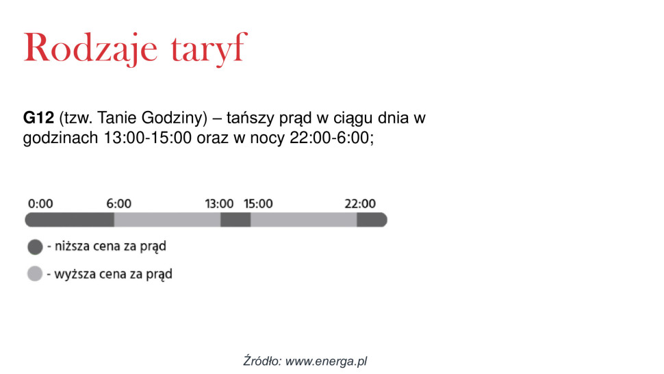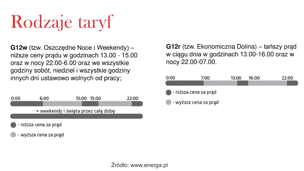 W taryfie G12 (tzw. tanie godziny) energia jest tańsza w godzinach nocnych (22.00-6.00) oraz w południe (13.00-15.00).W pozostałych godzinach obowiązują wyższe stawki. Z kolei taryfa G12w (tzw. oszczędne noce i weekendy) oferuje niższe ceny również w weekendy i święta.