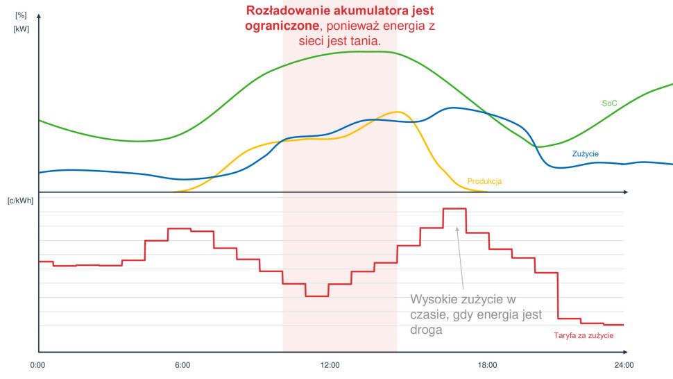 - Kiedy energia jest droższa. Zmagazynowana energia jest wykorzystywana do zasilania odbiorników, co pozwala ograniczyć koszty zakupu energii z sieci.