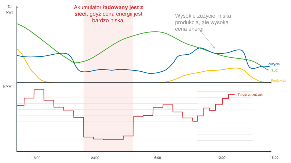 - Taryfy dynamiczne. Algorytm uwzględnia aktualne i prognozowane ceny energii elektrycznej, co pozwala na optymalizację momentu ładowania i rozładowywania akumulatora.