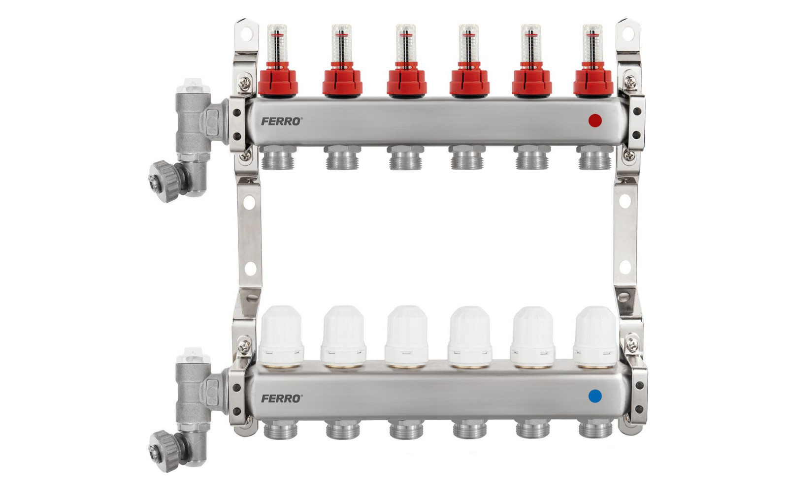 W ofercie FERRO znajdują się rozdzielacze wykonane z mosiądzu lub stali nierdzewnej, które zapewniają równomierne rozprowadzanie ciepła do każdego pomieszczenia oraz pętli, gwarantując oszczędność energii i komfort użytkowania.