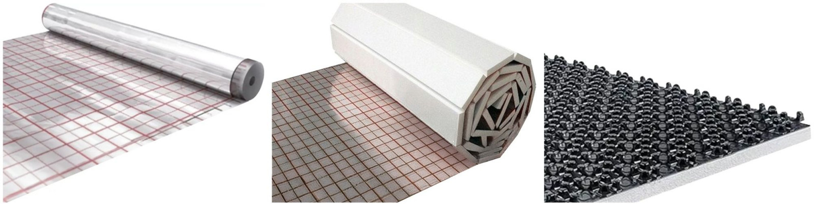 Folia aluminiowa z rastrem do ogrzewania podłogowego (F50), mata styropianowa z folią aluminiową do ogrzewania podłogowego (FS30) i mata styropianowa grzybkowa (PTS30)
