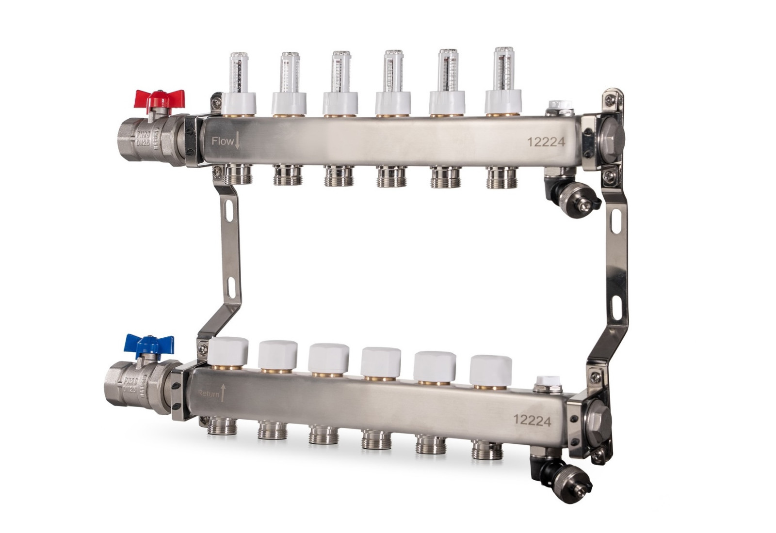 Rozdzielacz do ogrzewania podłogowego ze stali nierdzewnej Reliance Valves z zaworami kulowymi i zintegrowanym ręcznym/automatycznym odpowietrznikiem.
