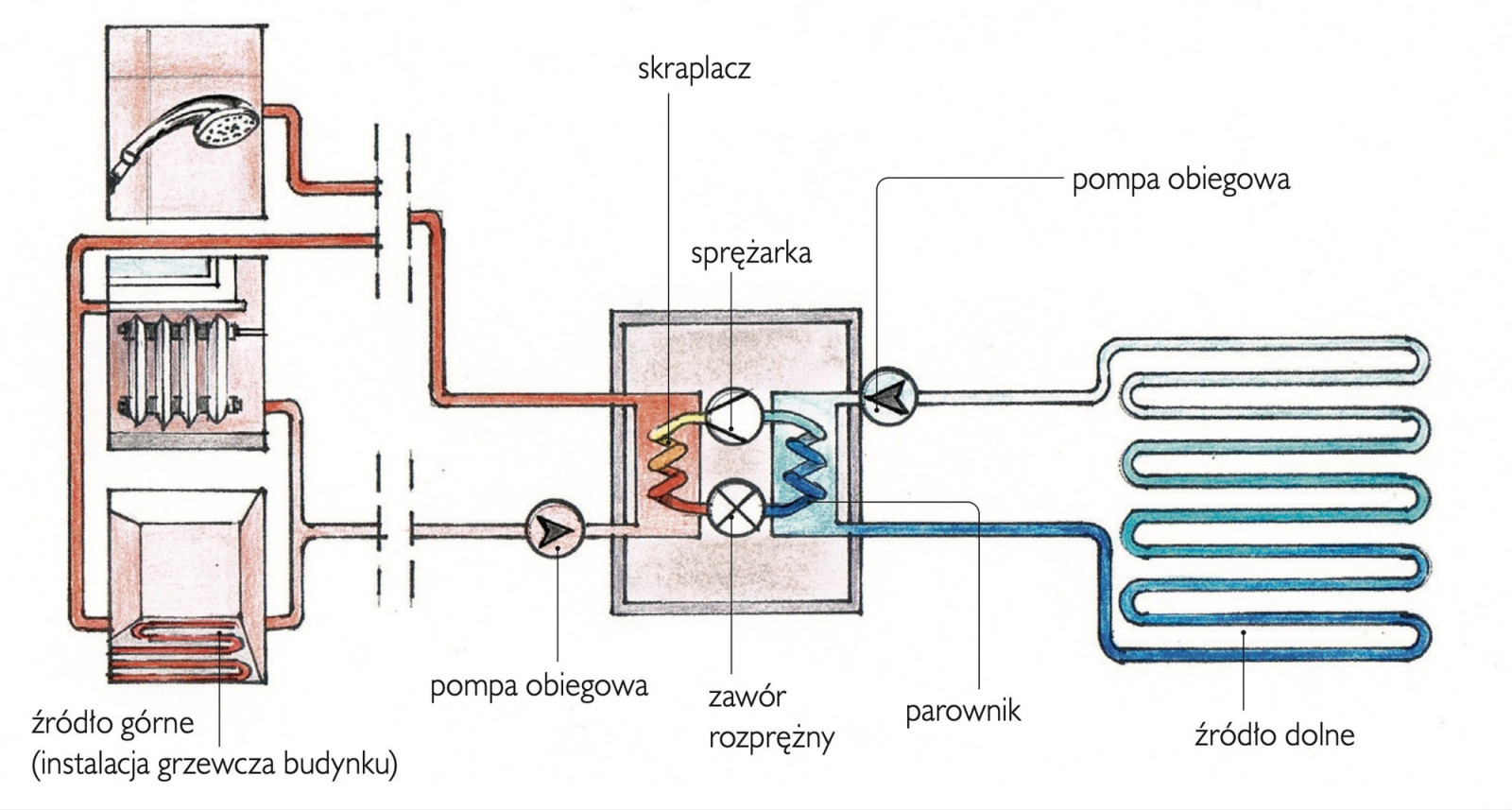 Parownik odbiera ciepło z otoczenia, natomiast skraplacz umożliwia jego przekazanie do instalacji c.o.