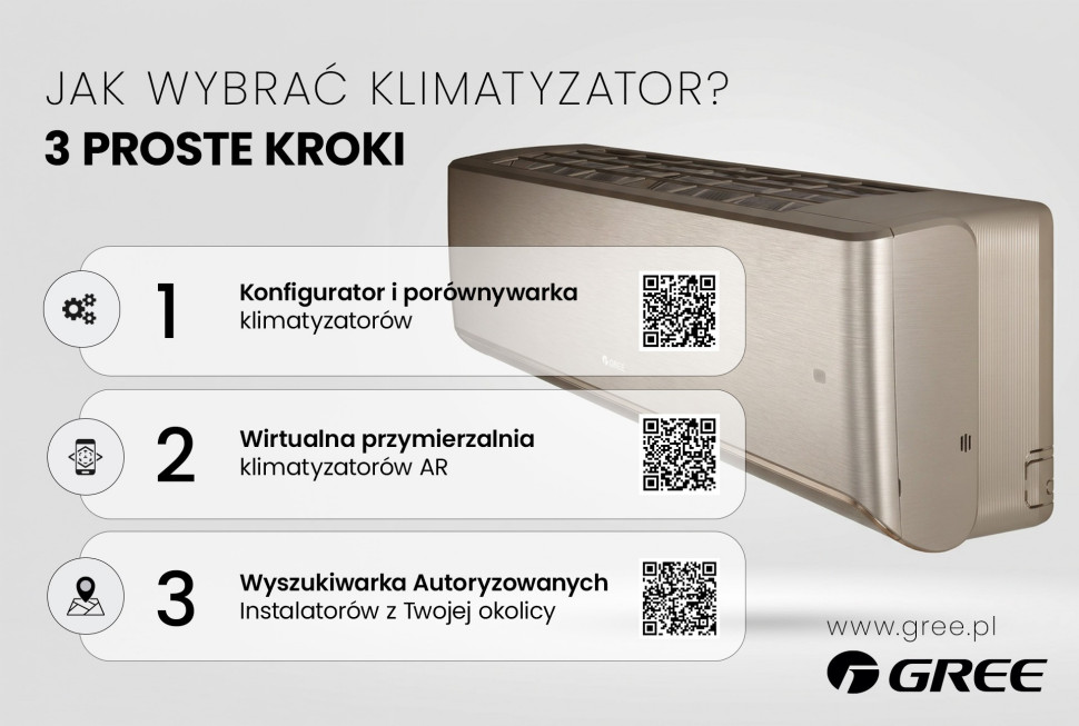 Marka Gree, z której urządzeń klimatyzacyjnych korzysta już 600 mln użytkowników na całym świecie, przygotowała krótki poradnik oraz wygodne narzędzia online, które przeprowadzą Cię przez proces doboru idealnego klimatyzatora. To Konfigurator i porównywarka klimatyzatorów, Wirtualna Przymierzalnia AR oraz Wyszukiwarka Autoryzowanych Instalatorów. Zanim jednak przejdziemy do narzędzi, powinniśmy wiedzieć, na co zwrócić uwagę przed zakupem.