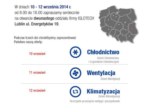 W dniach 10-12 września 2014 r. serdecznie zapraszamy na oficjalne otwarcie nowego oddziału Iglotech w Lublinie. Wielkie otwarcie będzie trwać 3 dni, podczas których będzie można poznać pełną ofertę firmy, zapoznać się z warunkami współpracy i przede wszystkim skorzystać z wielu przygotowanych specjalnie na ten dzień atrakcji.