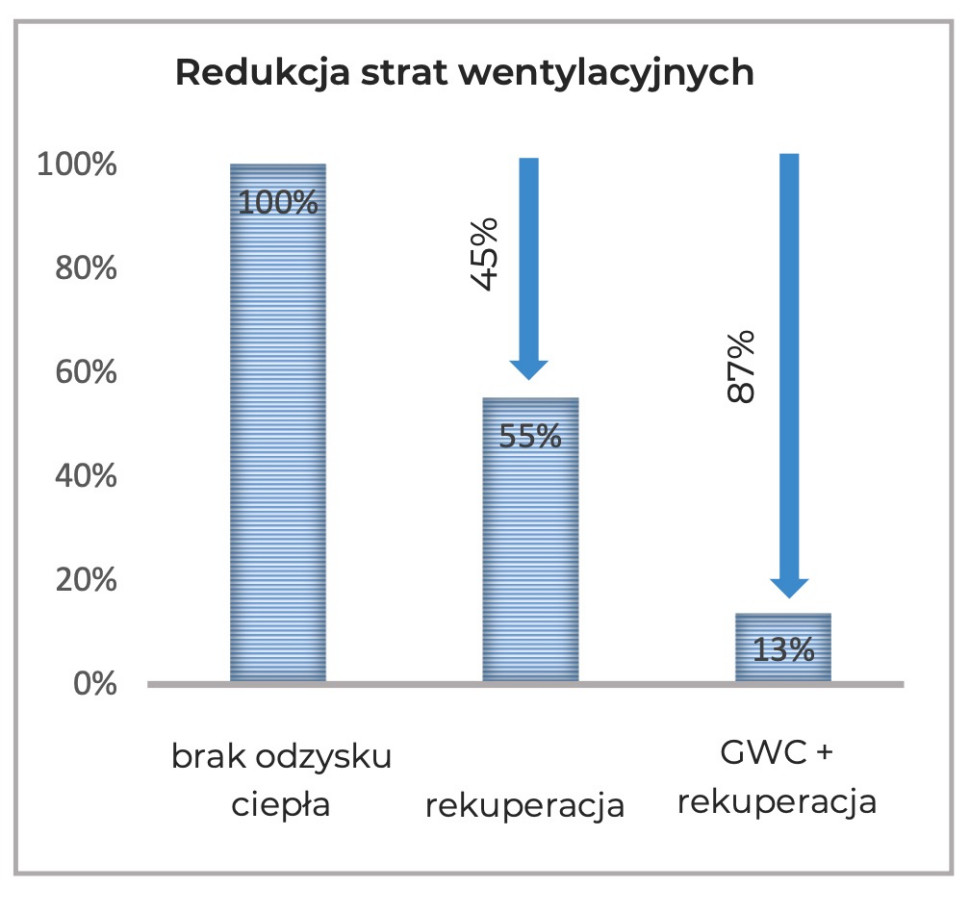 Zimą. GWC skutecznie podnosi temperaturę powietrza wentylacyjnego dopływającego do rekuperatora. Stabilizacja temperatury powietrza eliminuje konieczność stosowania wstępnych nagrzewnic elektrycznych i zwiększa sprawność całego procesu rekuperacji. Dzięki temu minimalizuje się straty ciepła z budynku wraz z powietrzem wentylacyjnym, co ogranicza zapotrzebowanie na ogrzewanie i przekłada się na niższe koszty. Zastosowanie płytowego gruntowego wymiennika ciepła pozwala na redukcję strat wentylacyjnych o 75% w porównaniu z rekuperacją bez GWC.
