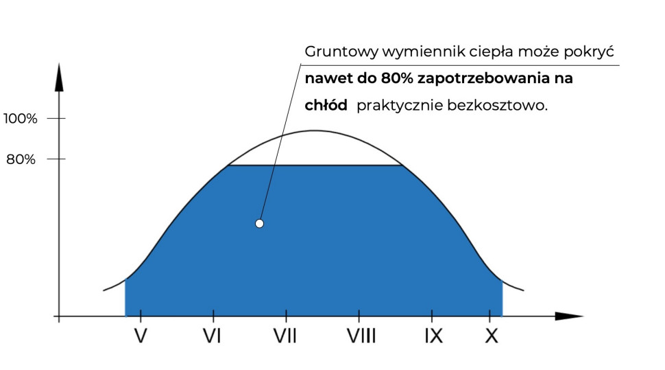 Latem. Efektywny gruntowy wymiennik ciepła pozwala pokryć od 70% do 90% zapotrzebowania budynku na chłód, generując przy tym minimalne koszty eksploatacji. Firma PRO-VENT informuje, że ich płytowy gruntowy wymiennik ciepła może pokryć nawet do 80% zapotrzebowania na chłód, charakteryzując się znikomymi kosztami eksploatacji. Budynek jest chłodzony świeżym powietrzem zewnętrznym, co stanowi dodatkową zaletę w porównaniu z klimatyzatorami działającymi w obiegu zamkniętym. GWC może schładzać powietrze wentylacyjne do temperatury w zakresie od +15°C do +16°C.