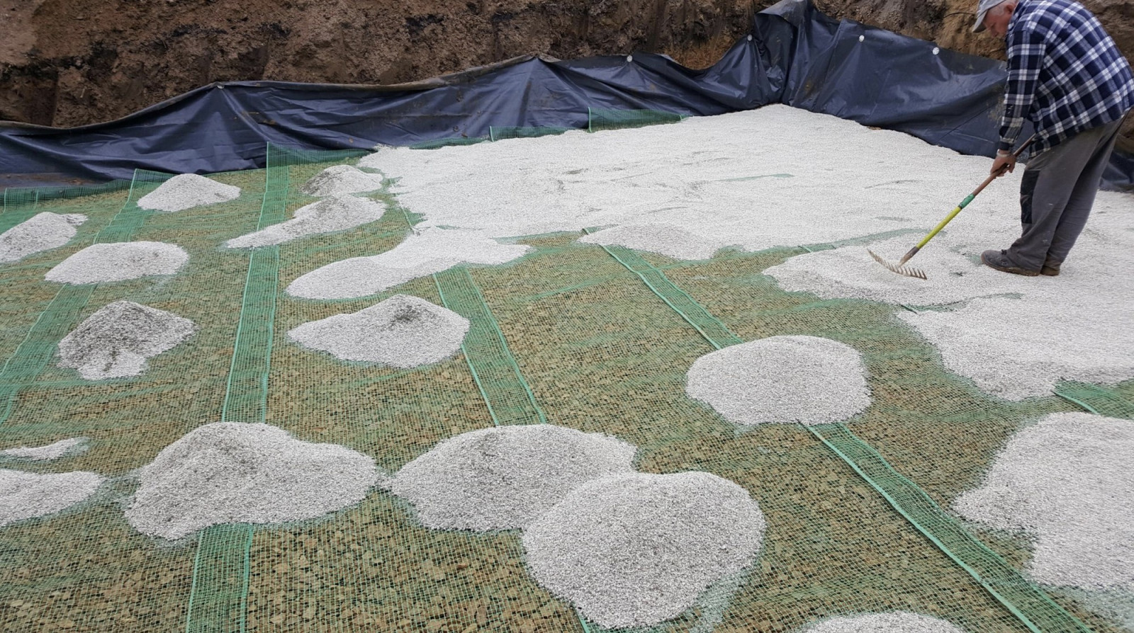 Na zagęszczonej podbudowie układa się siatkę, która dodatkowo stabilizuje warstwę pod wymiennikiem i zabezpiecza instalację przed kretami. Pasy siatki należy układać z zakładką od 5 do 10 cm, tak aby nie powstawały szczeliny między sąsiednimi odcinkami.