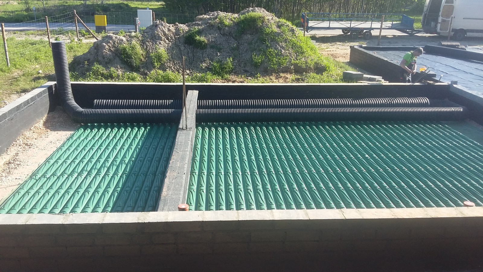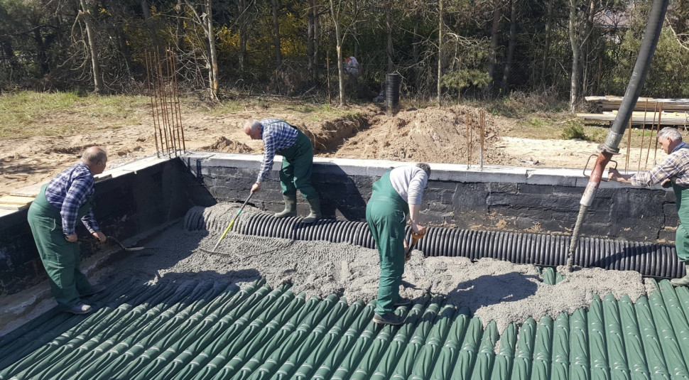 Do tego etapu stosuje się beton zwykły klasy B-20. Płyty zalewa się wyłącznie do wysokości górnej części łuków, bez przykrywania ich w całości. W ten sposób powstają betonowe stopy nośne, które nadają całemu systemowi odporność na nacisk rzędu 434 t/m². Po związaniu betonu GWC staje się trwałą częścią instalacji wentylacyjnej.