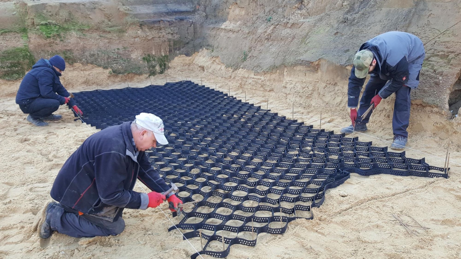 Na wyrównanym gruncie rozkłada się geokratę komórkową, która stabilizuje podłoże pod całą konstrukcją. Geokratę trzeba rozciągnąć na całej powierzchni wymiennika z naddatkiem minimum 25 cm z każdej strony. Jej zewnętrzne krawędzie należy unieruchomić, na przykład za pomocą prętów zbrojeniowych lub drewnianych palików wbitych w grunt. Dzięki temu geokrata zachowa właściwy kształt podczas zasypywania i wyrównywania podbudowy.