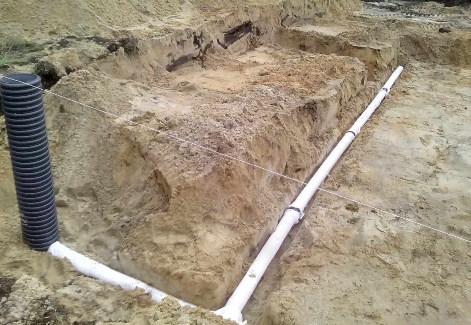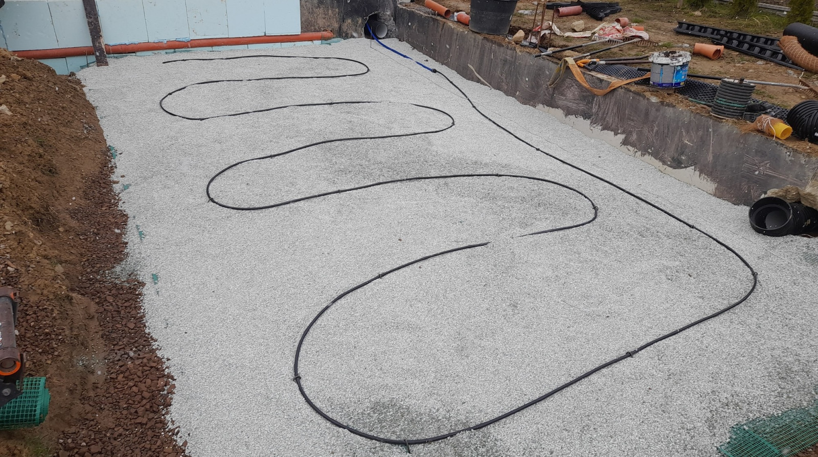 Prace zaczynają się od wykonania wykopu dopasowanego do wymiarów projektowanego wymiennika. Dno wykopu powinno być większe o około 0,7 m z każdej strony w stosunku do finalnej powierzchni montowanego GWC. Musi być równe i przygotowane pod kolejne warstwy nośne. Jeżeli na działce istnieje ryzyko okresowego podniesienia poziomu wód gruntowych, przed montażem trzeba wykonać drenaż kontrolny. Rury drenażowe układa się poza obrysem wymiennika i poniżej poziomu jego posadowienia. Podłoże całego wykopu formuje się wtedy ze spadkiem około 3% w kierunku studzienki kontrolnej, zlokalizowanej w narożniku. Taki układ umożliwia późniejsze odprowadzenie lub odpompowanie wody.