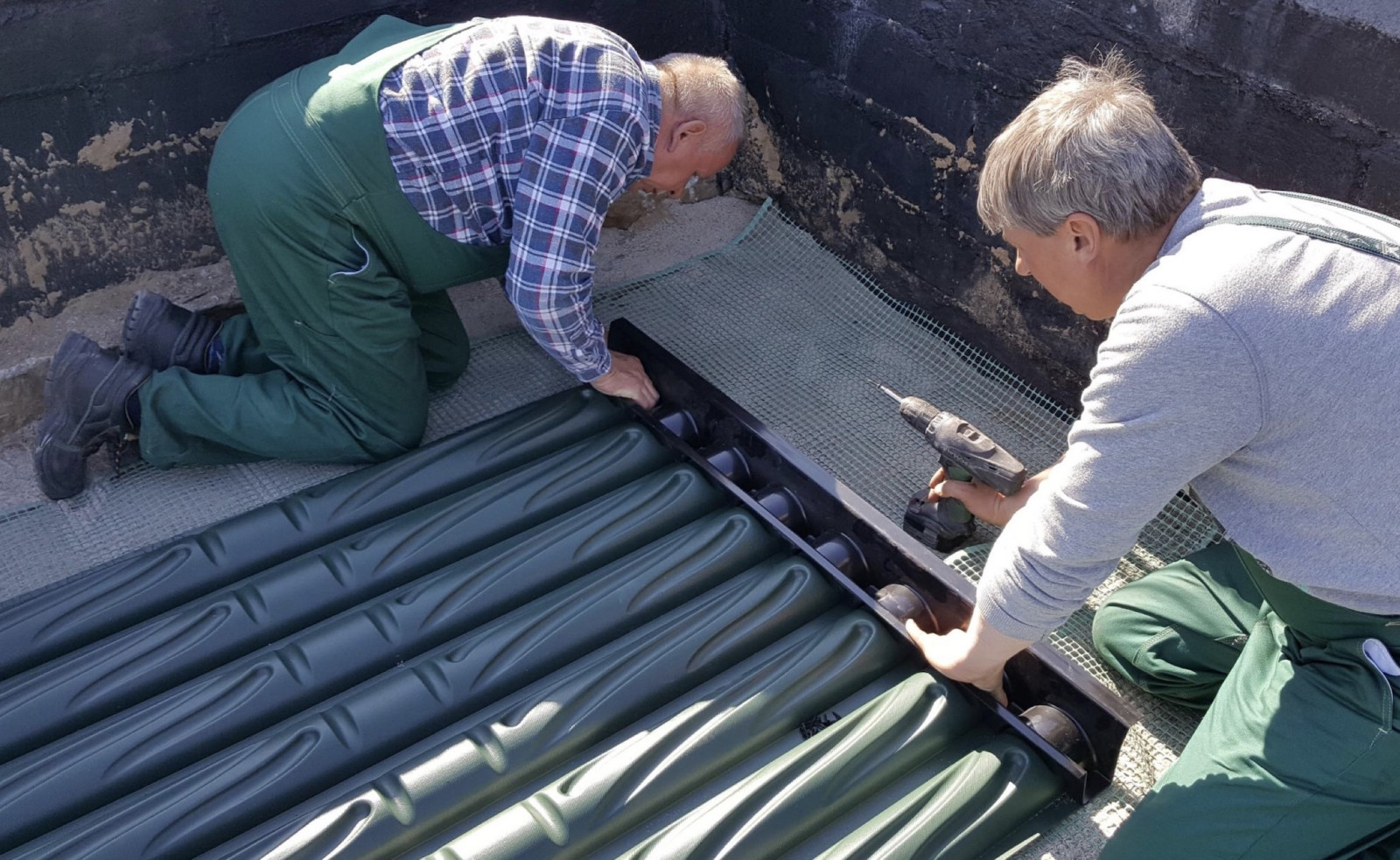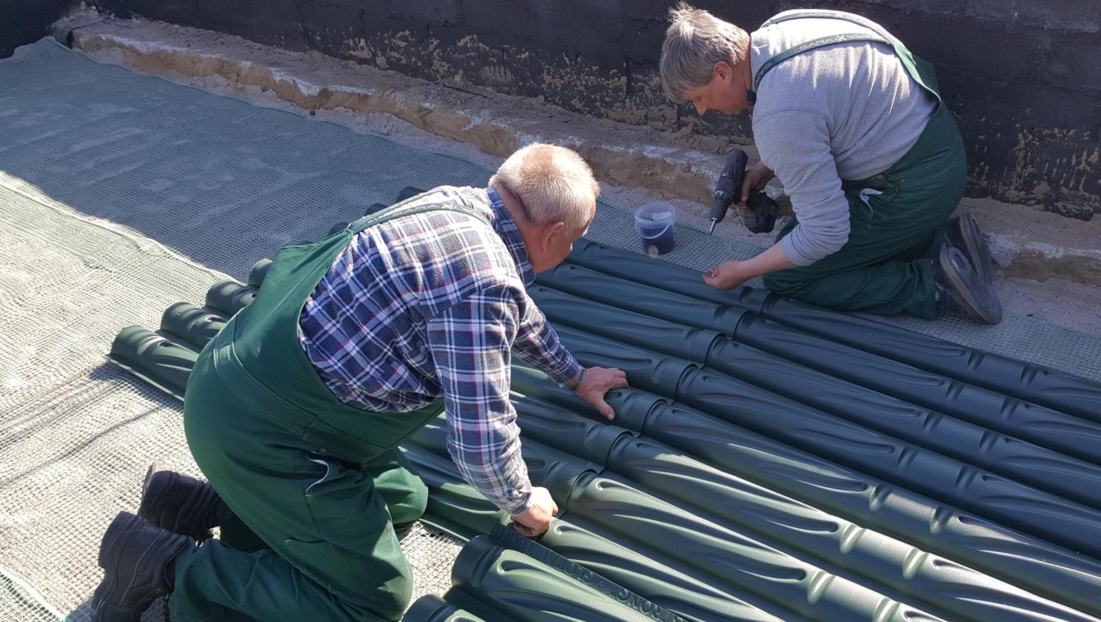 Do skręcania płyt stosuje się wkręty do plastiku i drewna 3,5 x 25 mm, rozmieszczane co 25–30 cm. Taki rozstaw zapewnia odpowiedni docisk na całej długości połączenia i usztywnia konstrukcję przed kolejnymi etapami montażu. Po skręceniu wszystkich modułów powstaje jednolita powierzchnia, która stanowi zasadniczy korpus gruntowego wymiennika ciepła.