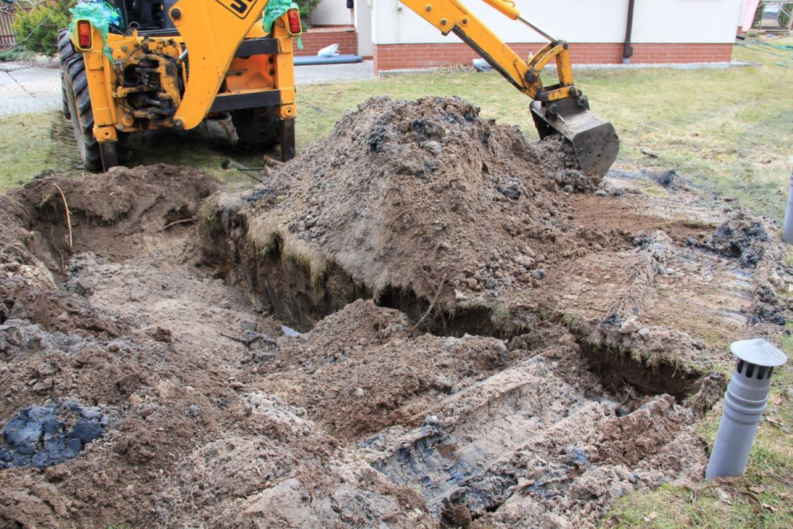 Wezwany serwisant wskazał jako przyczynę problemu zamulony drenaż. Naprawa polegała na zastąpieniu pakietów z tworzywa 12 t płukanego żwiru frakcji 16–32 mm. Rury drenażowe po wyczyszczeniu wykorzystano ponownie. Na filtracyjnej warstwie kruszywa ułożono je ze spadkiem umożliwiającym grawitacyjny spływ ścieków (1–1,5%). Od góry również zostały obsypane kruszywem. Całość okryto geowłókniną - aby ziemia nie zatkała przestrzeni między ziarnami żwiru, i zasypano. Zdaniem fachowca, tradycyjne rozwiązanie z drenażem na żwirze wystarczy na kolejnych 20 lat.