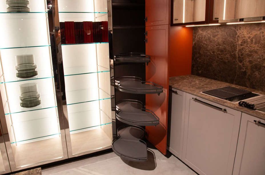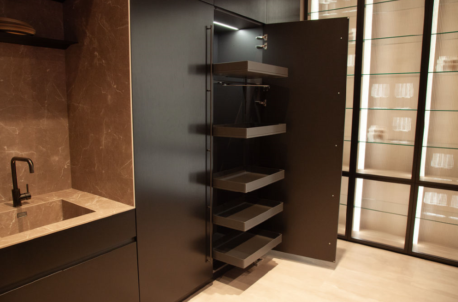 W nowoczesnych aranżacjach liczy się nie tylko wygląd, ale i sprytne wykorzystanie przestrzeni. Rozwiązania takie jak wysokie systemy przechowywania Tandem czy Pleno Maxi Plus zapewniają pełny dostęp do zawartości szafek, zachowując przy tym elegancję – ich antracytowe wykończenia doskonale komponują się z nowoczesnym designem. Nawet problematyczne narożniki nie stanowią już wyzwania – systemy LeMans II i Magic Corner Comfort zamieniają je w w pełni funkcjonalne strefy, umożliwiając maksymalne wykorzystanie każdego centymetra zabudowy.
