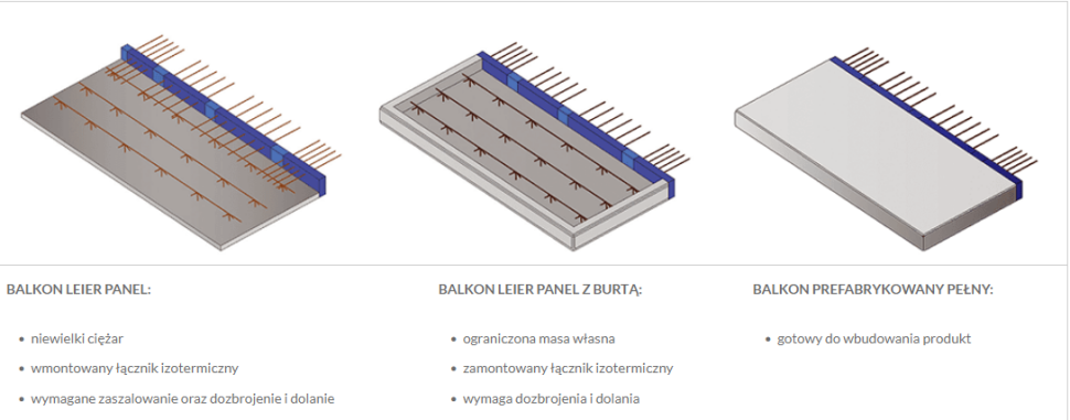 W zależności od potrzeb, dostępne są trzy główne warianty płyt: pełne, Leier-Panel oraz Leier-Panel z burtą. Możliwe jest wykonanie balkonów wspornikowych, wspornikowych z żebrami oraz podpartych. Dużą zaletą tego rozwiązania jest elastyczność projektowa – kształt prefabrykowanych balkonów może być praktycznie dowolny. Jedynym ograniczeniem pozostają warunki transportowe i montażowe.