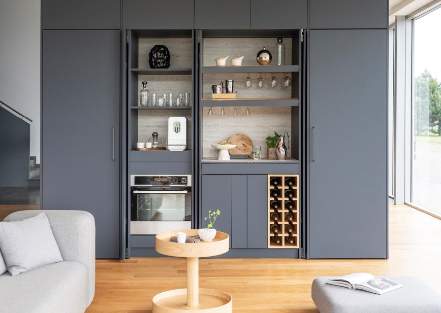 Zgodnie z aktualnymi trendami postawiliśmy na układy kuchenne z ukrytymi strefami. Dzięki systemom przesuwnym HAWA udało się zaplanować między innymi schowaną strefę parzenia kawy, barek śniadaniowy, przestrzeń do serwowania wina czy tzw. mokrą strefę z ukrytym zlewem i koszem na śmieci. Po zamknięciu wszystko znika za gładkimi frontami, co pozwala zachować estetykę i porządek. Tego typu zabudowy pokazują, jak funkcjonalnie można zorganizować codzienność, nie rezygnując z elegancji.