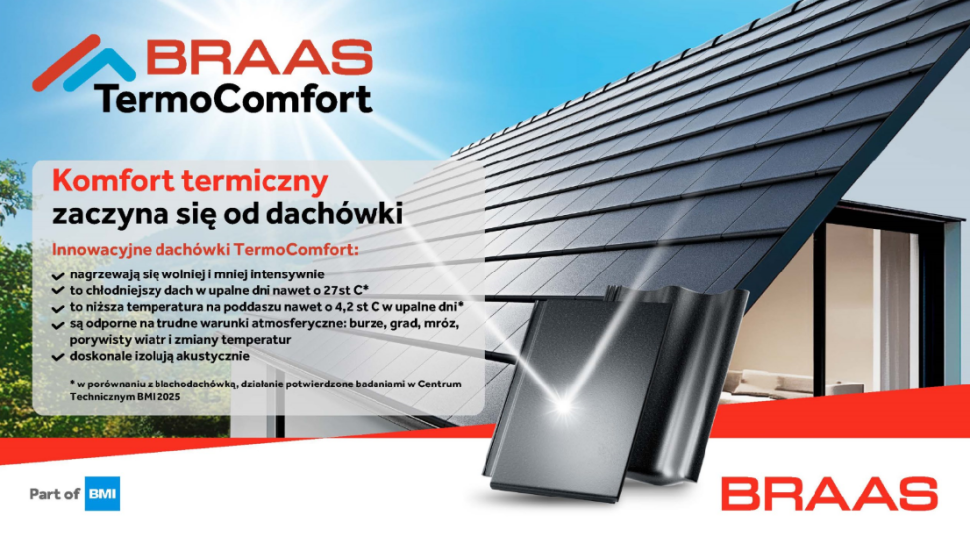 * w porównaniu z blachodachówką, działanie potwierdzone badaniami w Centrum Technicznym BMI 2025