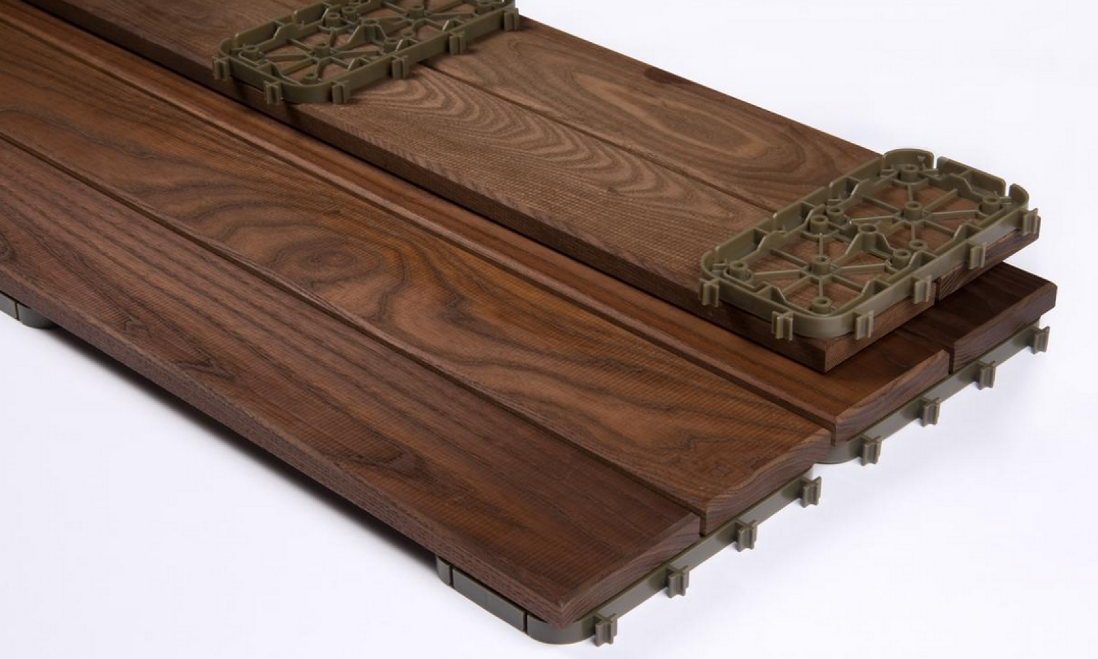 Co ważne, płytki zamocowane są na specjalnych podstawach z wytrzymałego tworzywa sztucznego, wyposażonych w zaczepy. Sprawia to, że montaż jest szybki i niezwykle prosty – elementy układa się na wylewce, starych płytkach, kostce brukowej czy innym stabilnym podłożu. Nie ma potrzeby stosowania legarów, co ma ogromne znaczenie zwłaszcza na balkonach, gdzie każdy centymetr wysokości jest na wagę złota.