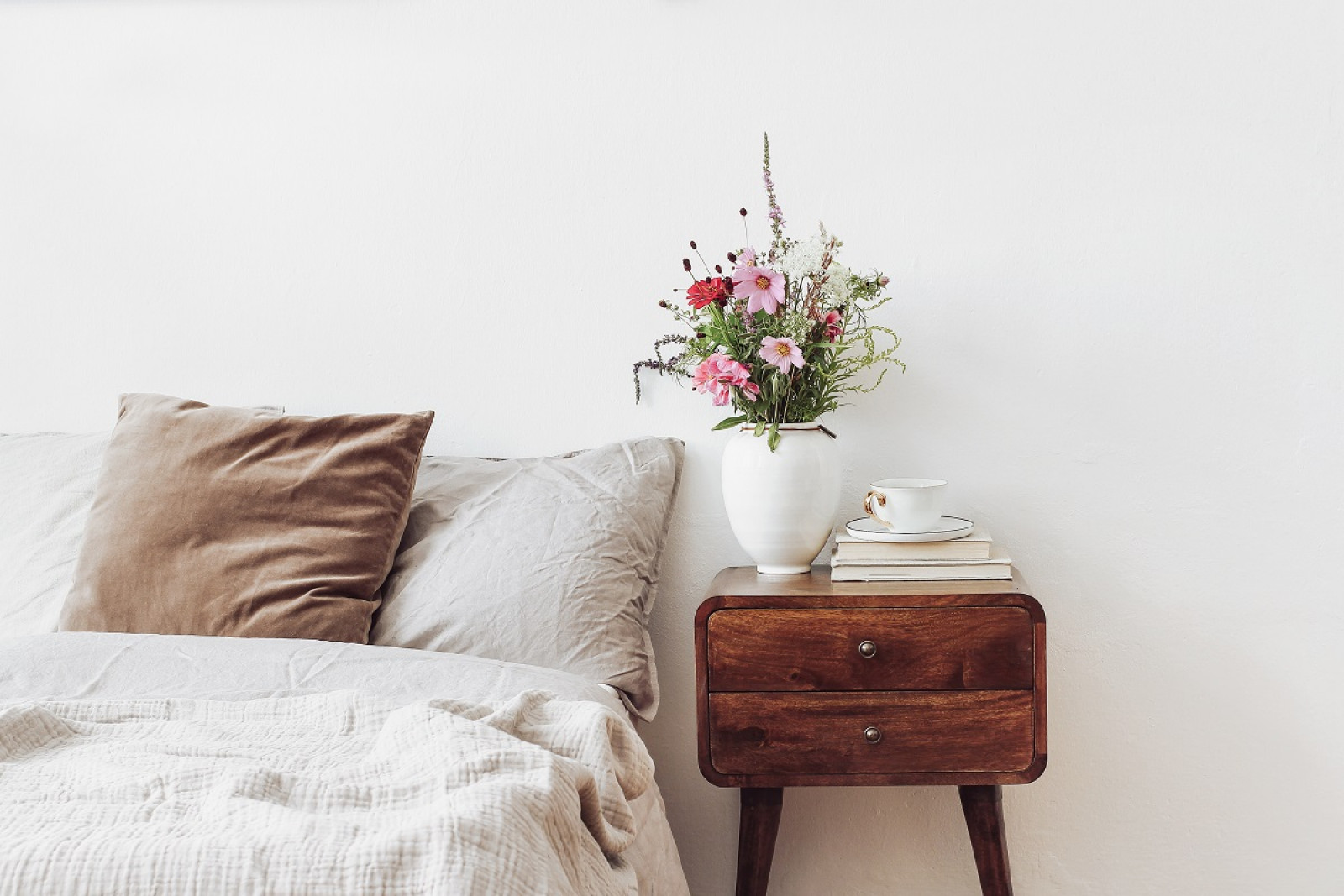 Również w sypialni odcienie szarości potrafią stworzyć atmosferę pełną spokoju i subtelności. Ściany w delikatnej tonacji z palety Tikkurila Optiva Matt 5 współgrają z lnianą pościelą i naturalnymi dodatkami, jak wazon z kwiatami. Całość uzupełnia stolik w stylu vintage, który wprowadza nutę romantycznej klasyki. Tak zaaranżowana przestrzeń koi zmysły i sprzyja odpoczynkowi.