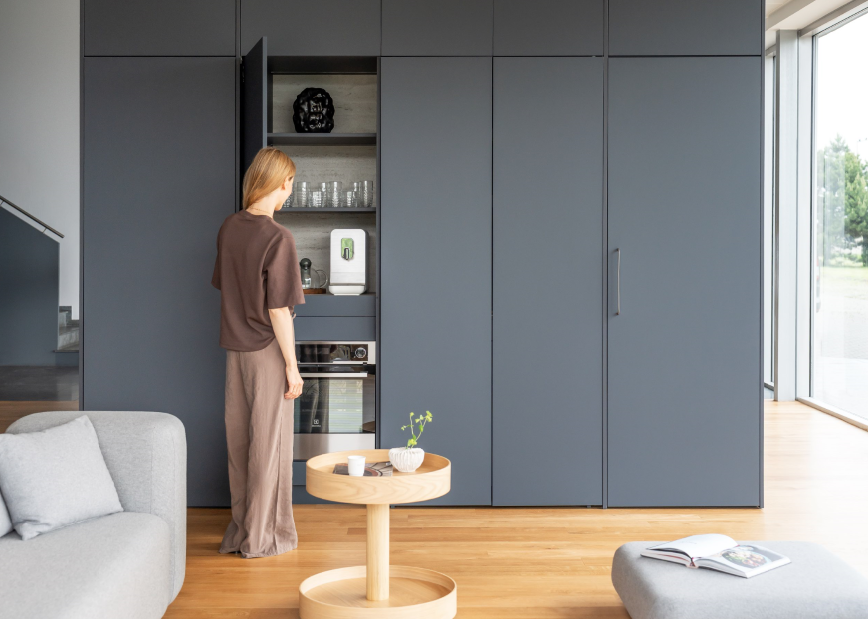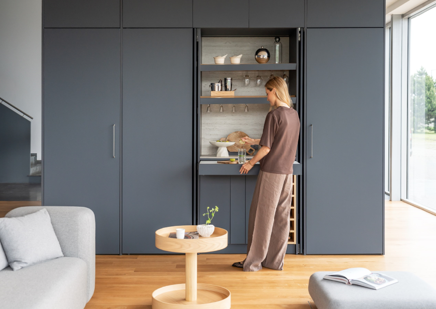 Jednym z rozwiązań są nowoczesne systemy, które pozwalają na dosłowne ukrycie kuchni, kiedy nie jest używana. Przykładem jest system HAWA Concepta, który umożliwia wsuwanie frontów pomiędzy korpusu mebla. Wystarczy jeden ruch, by zabudowa z piekarnikiem, zlewem czy ekspresem do kawy zniknęła z pola widzenia.