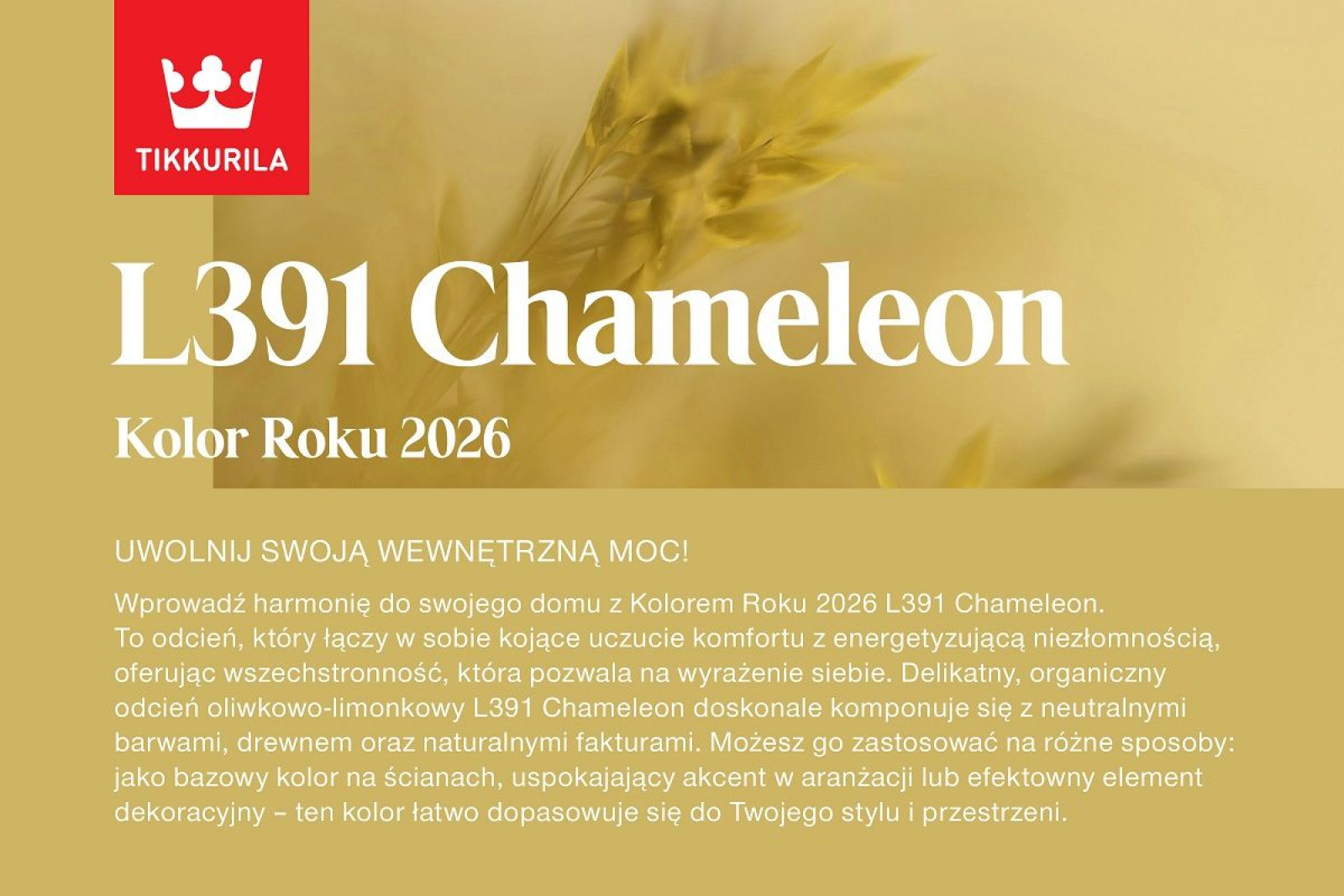 „Chameleon to wielowymiarowy odcień, który dostosowuje się do otoczenia. W świetle dziennym wywołuje poczucie spokoju, a w zacienionych lub słabo oświetlonych pomieszczeniach ujawnia wielowarstwową głębię, co czyni go wszechstronnym wyborem zarówno do wnętrz mieszkalnych, jak i przestrzeni komercyjnych. Barwa L391 Chameleon jest na tyle łagodna, by uspokajać, a jednocześnie na tyle żywa, by poprawić nastrój. W rezultacie wprowadza do przestrzeni kojący komfort i energetyzującą niezłomność, tworząc wnętrza budujące optymizm i wewnętrzną siłę” - komentuje Justyna Balińska, manager marki Tikkurila.