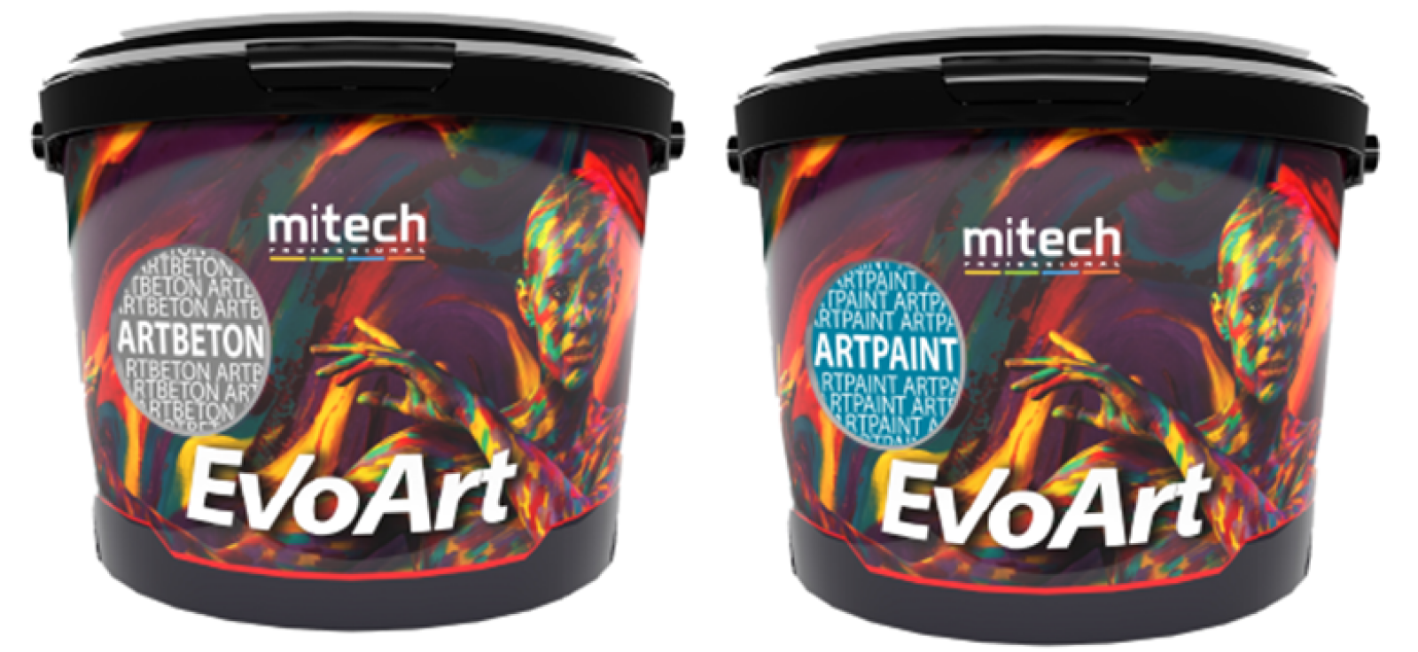 W skład systemu wchodzą 2 produkty – dekoracyjna masa tynkarska MITECH ARTBETON EVOART, która nadaje strukturę oraz farba lazurująca do efektów dekoracyjnych MITECH EVOART ARTPAINT dostępna w różnych odcieniach szarości dzięki temu każdy może dobrać intensywność ostatecznego wyglądu do swojej przestrzeni.