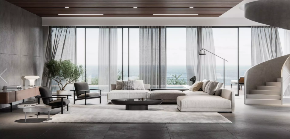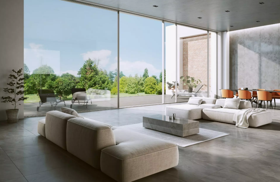Panoramiczne drzwi przesuwne umożliwiają całkowite otwarcie ściany, co pozwala na płynne połączenie salonu z tarasem, a jadalnię przekształca w przestrzeń ogrodową. Wielkoformatowe przeszklenia – zwłaszcza narożne lub sięgające kilku kondygnacji – nadają aranżacji spektakularny charakter: codzienne życie rozgrywa się na tle nieustannie zmieniającego się krajobrazu.