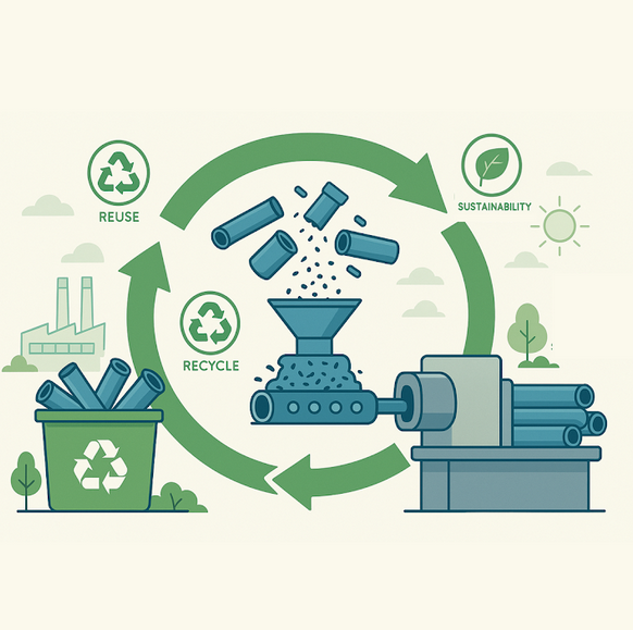 Proces recyklingu rur z tworzyw sztucznych zaczyna się od zbiórki i selekcji według rodzaju materiału. Następnie odpady poużytkowe są mechanicznie rozdrabniane, a powstały granulat dokładnie oczyszczany z wszystkich zanieczyszczeń. W efekcie otrzymujemy jednorodny recyklat – czysty surowiec, który nadaje się do wytwarzania trwałych i wytrzymałych wyrobów.