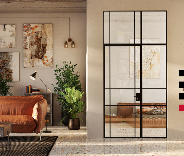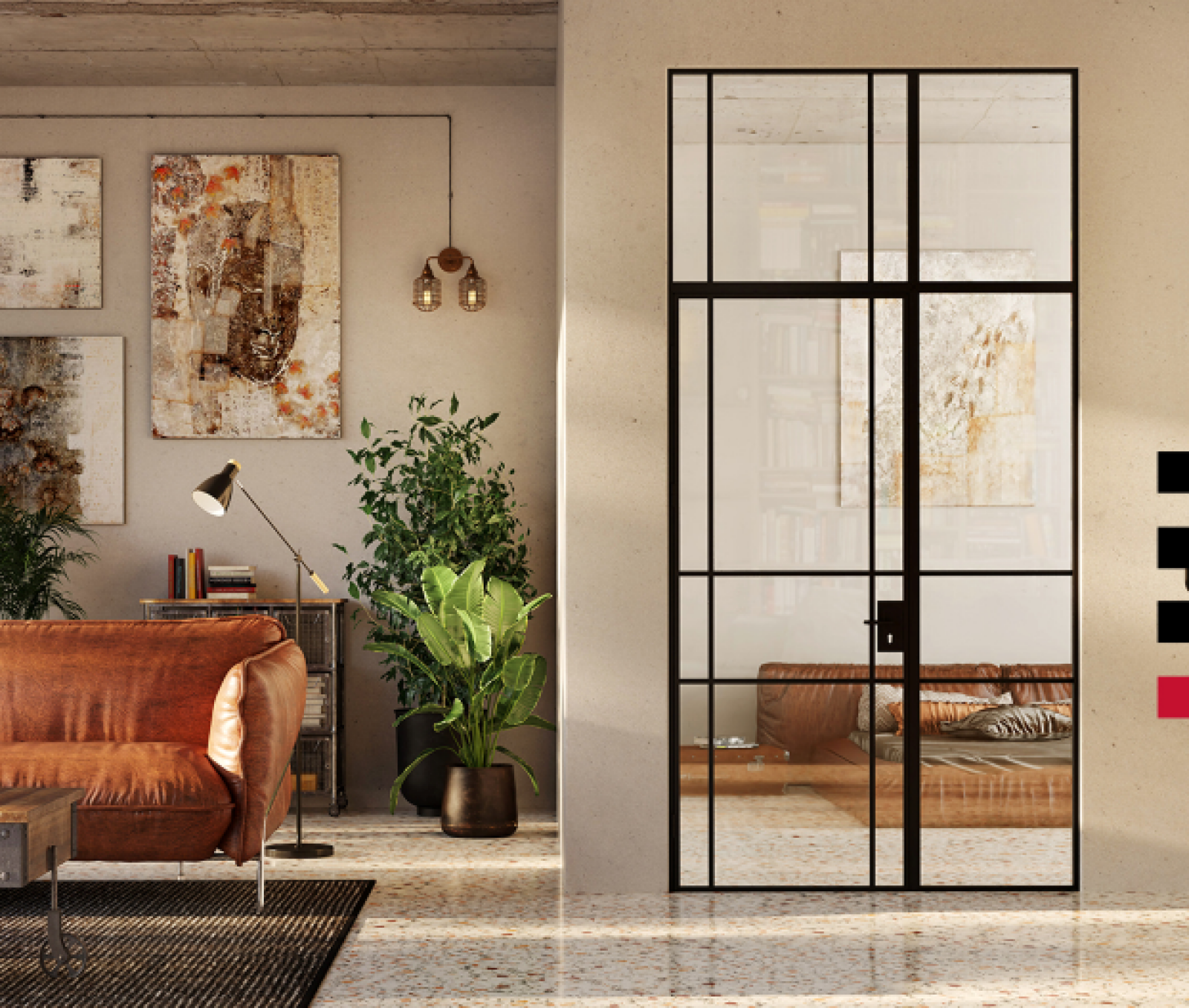 Drzwi LOFT to odpowiedź na potrzebę wyrazistej, ale nieprzytłaczającej przegrody. Stal zapewnia stabilność i odporność na codzienne użytkowanie, a szkło otwiera przestrzeń i podkreśla geometrię podziałów. Ten duet pracuje szczególnie dobrze w korytarzach, aneksach kuchennych i strefach dziennych, gdzie liczy się naturalne doświetlenie i czytelny podział funkcji bez budowania ciężkich barier.