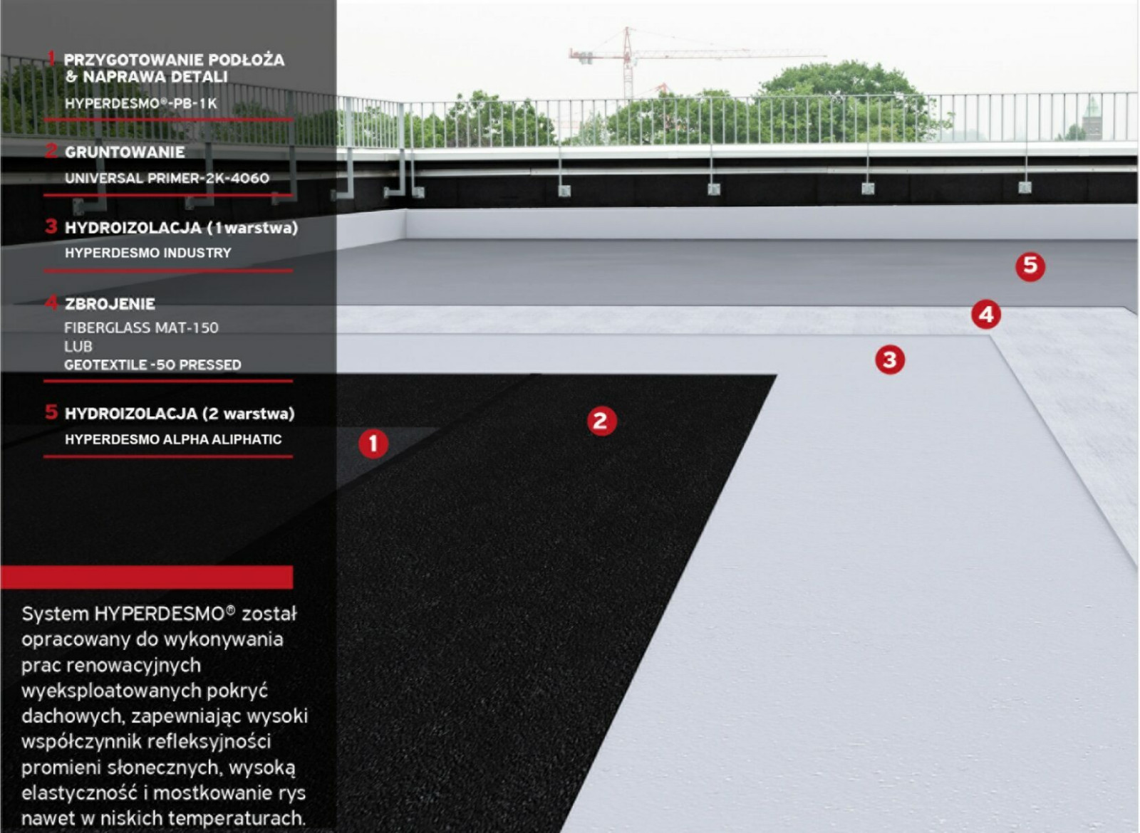 Zastosowano w pełni alifatyczny system płynnych membran poliuretanowych Hyperdesmo Alpha Aliphatic, opracowany przez Alchimica, który zapewnia: