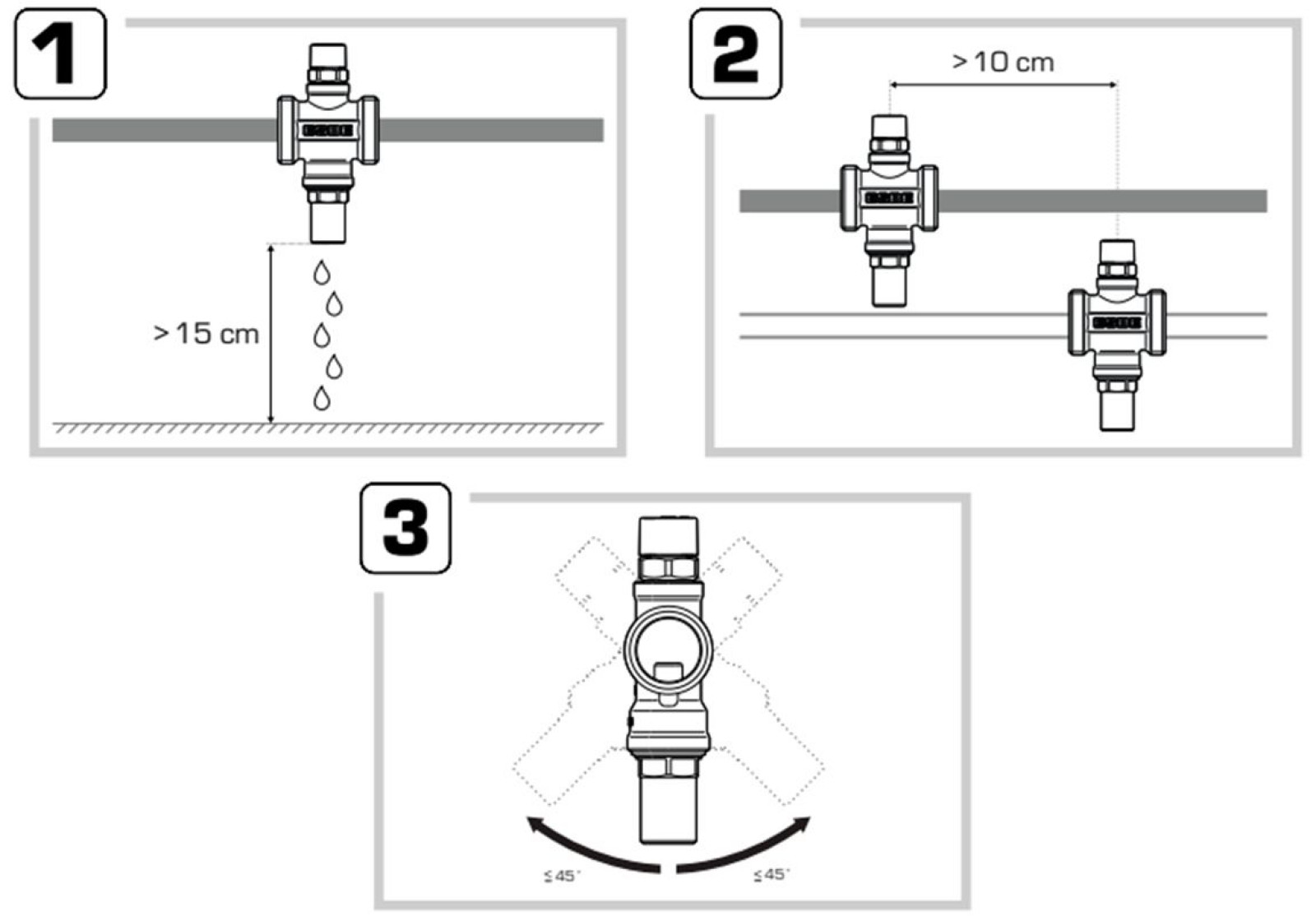 - Możliwa jest instalacja w pionie z odchyleniem ±45°, z przyłączami w standardzie G1” i G1 ¼”
