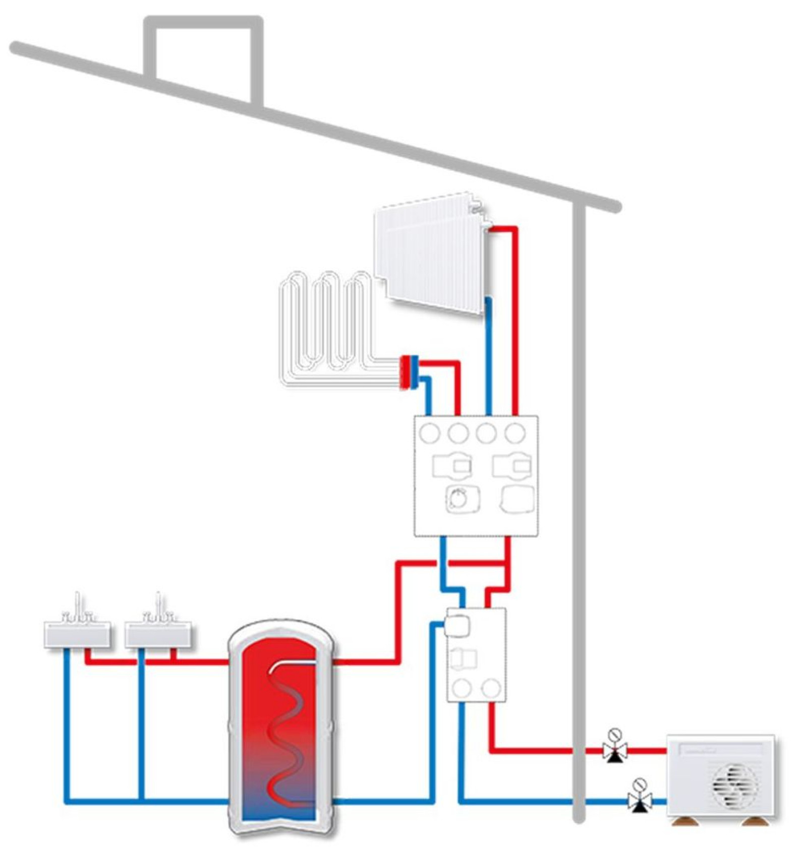 Zawór antyzamrożeniowy VTN umieszczony na zewnątrz w systemie monoblokowej pompy ciepła powietrze-woda.