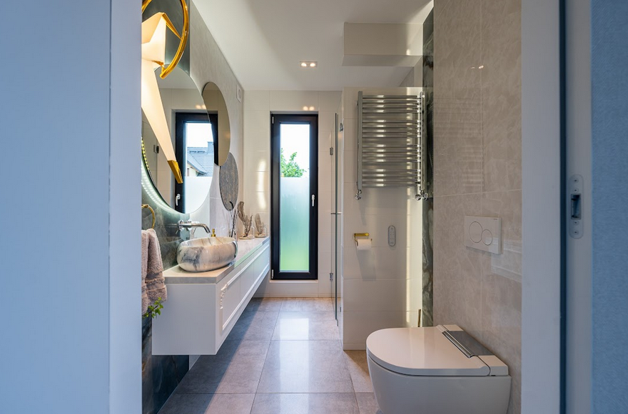 Przestrzeń wyposażono w nowoczesne rozwiązania Geberit – m.in. niezawodne stelaże podtynkowe Duofix, przyciski spłukujące Sigma oraz toalety myjące Geberit AquaClean Alba, które zapewniają wyjątkowy komfort użytkowania. Dzięki innowacyjnej technologii mycia wodą, toalety te gwarantują uczucie świeżości i doskonałej higieny, a jednocześnie idealnie wpisują się w minimalistyczny charakter wnętrza.