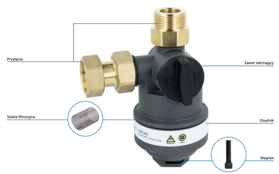 ADS 100 to kompaktowy separator magnetyczno-mechaniczny, czyli łączy dwa sposoby filtracji w jednej obudowie. Wewnątrz znajduje się siatka filtracyjna oraz mocny magnes neodymowy. Siatka zatrzymuje zanieczyszczenia niemetaliczne (np. piasek, szlam), a magnes „wyłapuje” cząstki metaliczne: opiłki, rdzę, drobiny żelaza. Dzięki temu do źródła ciepła wraca już oczyszczony czynnik.
