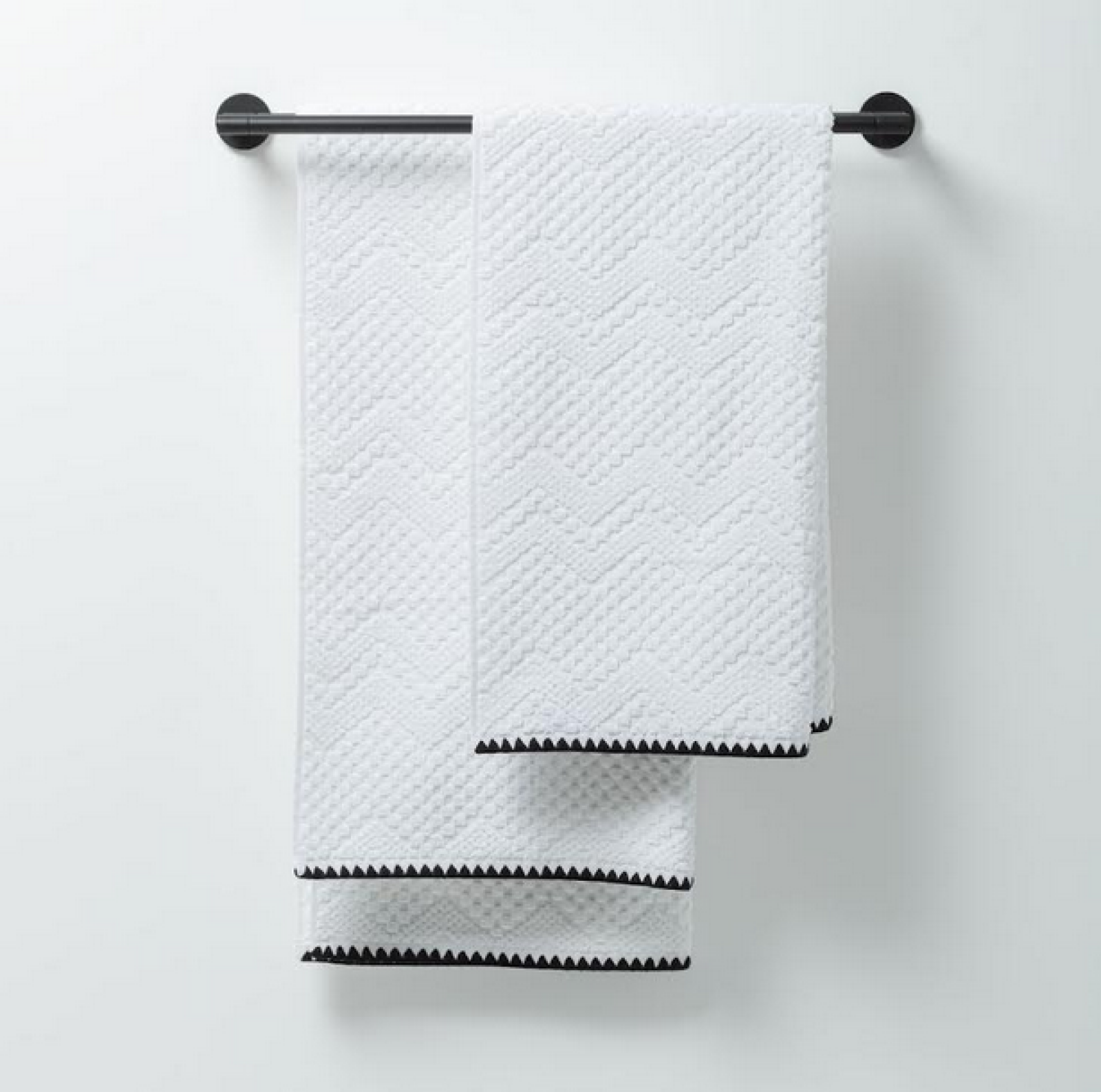 Najprostszym, a zarazem najbardziej efektownym sposobem na wprowadzenie kontrastu w łazience Cloud Dancer jest detal tekstylny. Ręczniki Sealskin Luna w kolorze białym z czarną lamówką są idealnym narzędziem do zarządzania wizualną ostrością.
