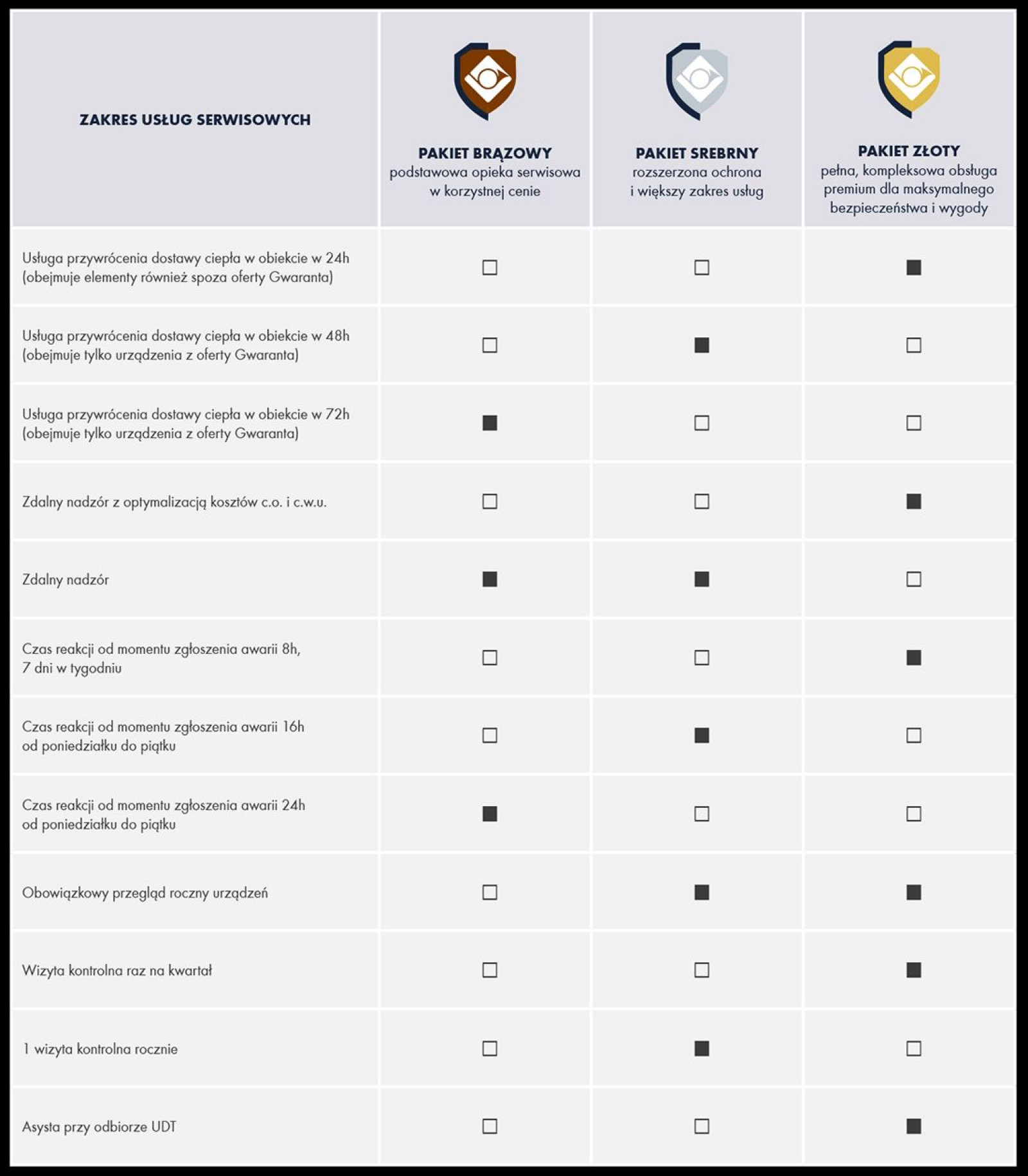 W opisie kontraktu złotego podano ten sam zakres, co przy srebrnym: zdalny nadzór (kocioł/PC) z optymalizacją kosztów c.o. i c.w.u., czas reakcji do 8 godzin, 7 dni w tygodniu, przegląd roczny, asysta przy odbiorze UDT oraz wizyta kontrolna raz na kwartał.