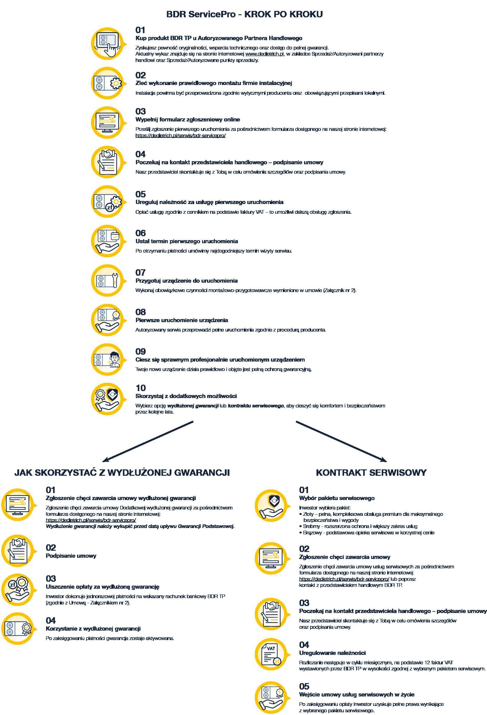 W ramach BDR ServicePro wydłużona gwarancja oznacza przedłużenie standardowej gwarancji producenta od 5 do 10 lat, dostęp do pomocy autoryzowanego serwisu w razie potrzeby oraz pewność, że sprzęt działa zgodnie z najwyższymi standardami i zaleceniami producenta. W praktyce to dodatkowy okres ochrony, w którym łatwiej zaplanować budżet eksploatacyjny i ograniczyć ryzyko kosztownych niespodzianek.