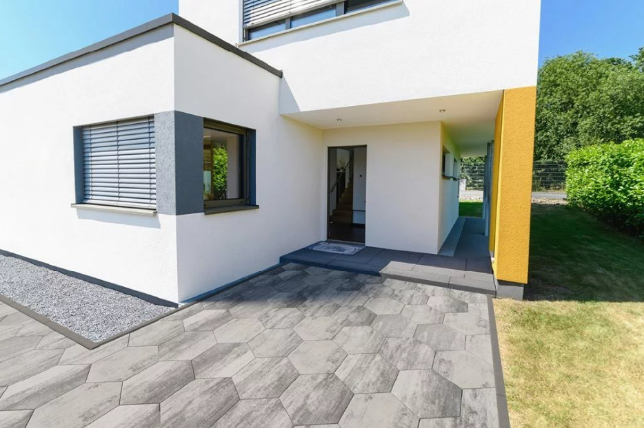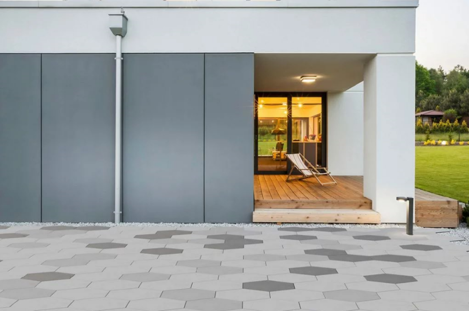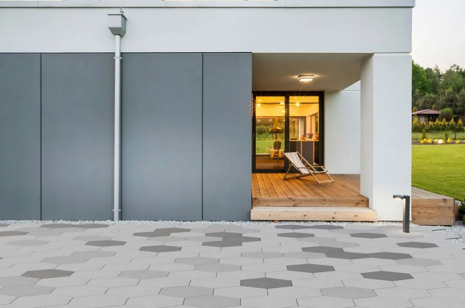 Sześciokąt świetnie wpisuje się w nowoczesne projekty, w których dominują uporządkowane linie, powtarzalność motywów i czytelna kompozycja. Efekt jest wyrazisty, ale nadal spójny, szczególnie gdy całość łączy się z bryłą budynku, ogrodzeniem, elewacją czy małą architekturą.