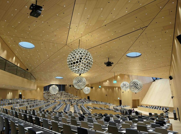 Sala konferencyjna WIPO, oddana do użytku w 2014 roku, to obiekt wyznaczający nowe standardy w architekturze korporacyjnej. Projekt przygotowany przez renomowane niemieckie biuro Behnisch Architekten ze Stuttgartu składa się z czterech połączonych prostopadłościanów, tworzących formę przypominającą pływającą rzeźbę. Największy element konstrukcyjny, dzięki drewnianemu występowi o długości 35 metrów, sprawia wrażenie zawieszonego w powietrzu, co nadaje budynkowi unikalną, spektakularną geometrię.