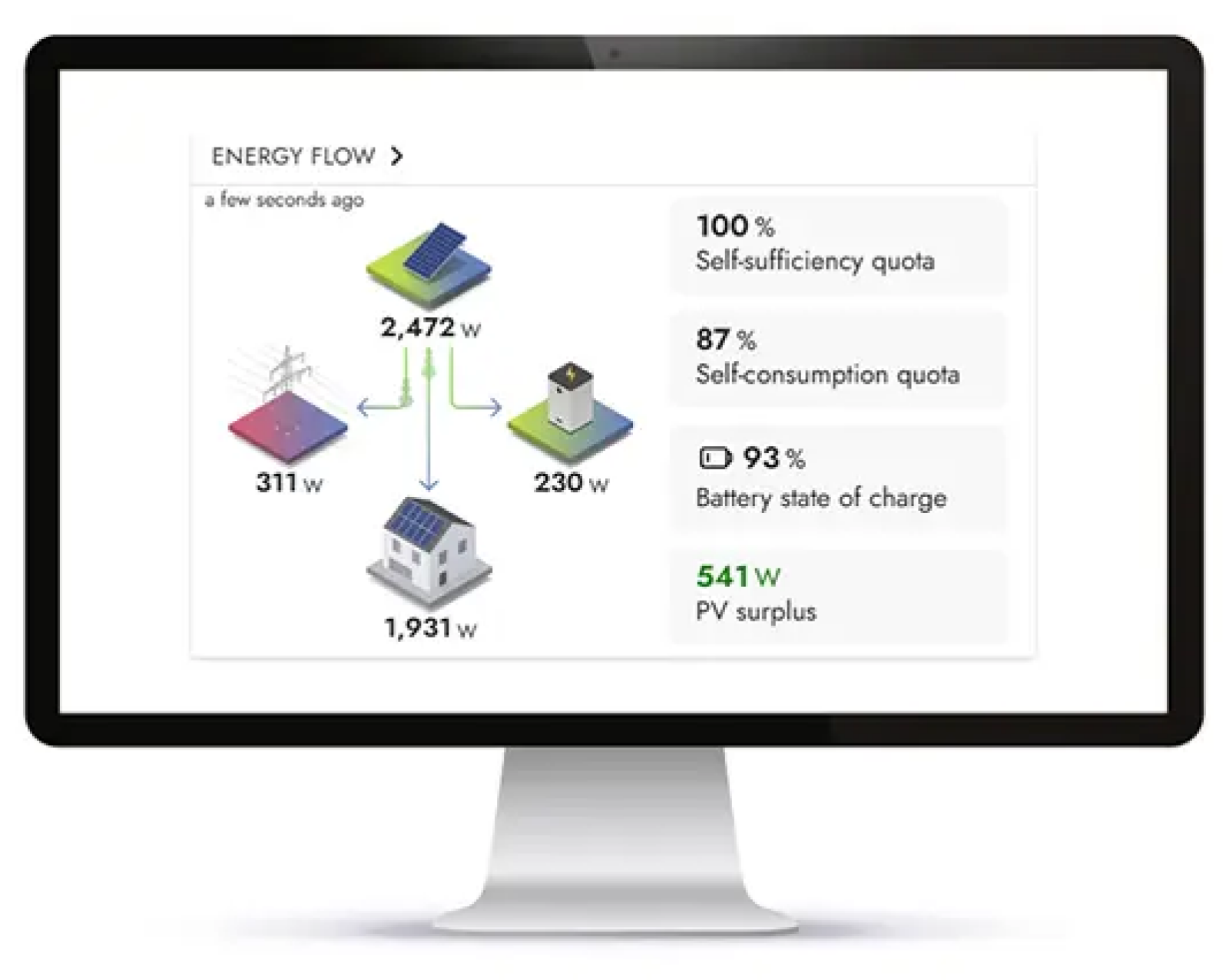 Użytkownik ma dostęp do przejrzystej wizualizacji przepływów energii w czasie rzeczywistym oraz szczegółowych diagramów produkcji PV, ładowania i rozładowywania baterii oraz wymiany z siecią. Możliwy jest widok zużycia energii na poziomie urządzeń, co ułatwia identyfikację najbardziej energochłonnych punktów w domu.