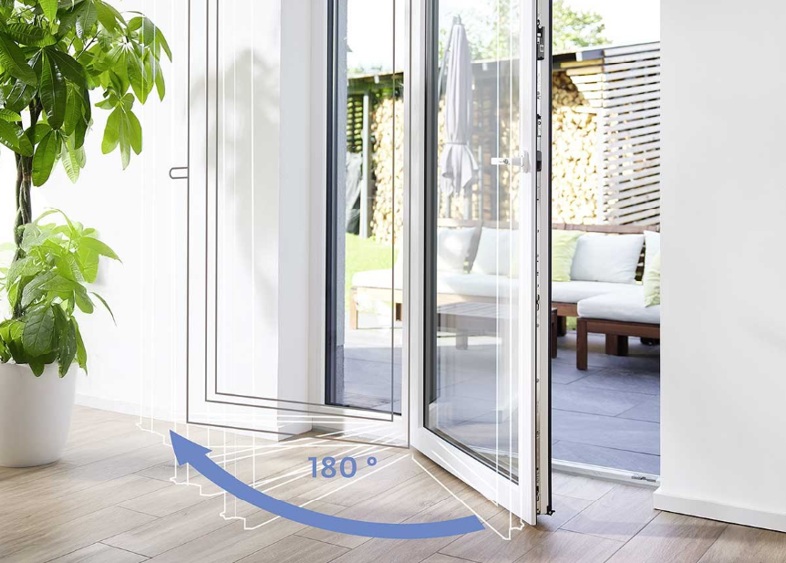 W grupie produktów TITAN kluczową innowacją jest ogranicznik otwarcia TITAN 90°, który chroni skrzydło i elewację przed uderzeniami, co jest szczególnie istotne w budynkach użyteczności publicznej.