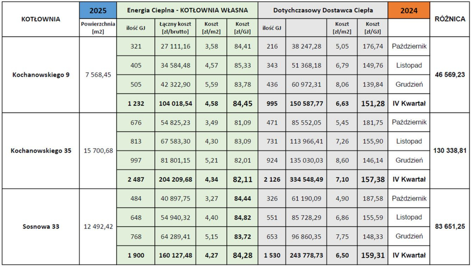 Lokalne kotłownie uruchomiono we wrześniu 2025 roku, a dane z IV kwartału 2025 roku jednoznacznie potwierdzają zasadność inwestycji. Trzy nowe kotłownie w Strzegomiu, wyposażone w nowoczesne kotły gazowe Termet, obniżyły koszty ogrzewania o ponad 30%. To porównanie wypada szczególnie wyraźnie na tle analogicznego okresu w 2024 roku, gdy budynki korzystały jeszcze z ciepła systemowego.